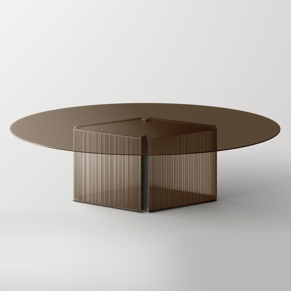 The real attraction of this table lies in its unique base, featuring thin vertical glass strips that not only support the top, but add an element of texture and visual movement . These lines, with their almost sculptural appearance, create an interesting play of light and shadow, transforming the table into a modern sculpture.