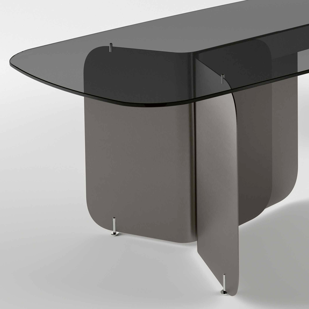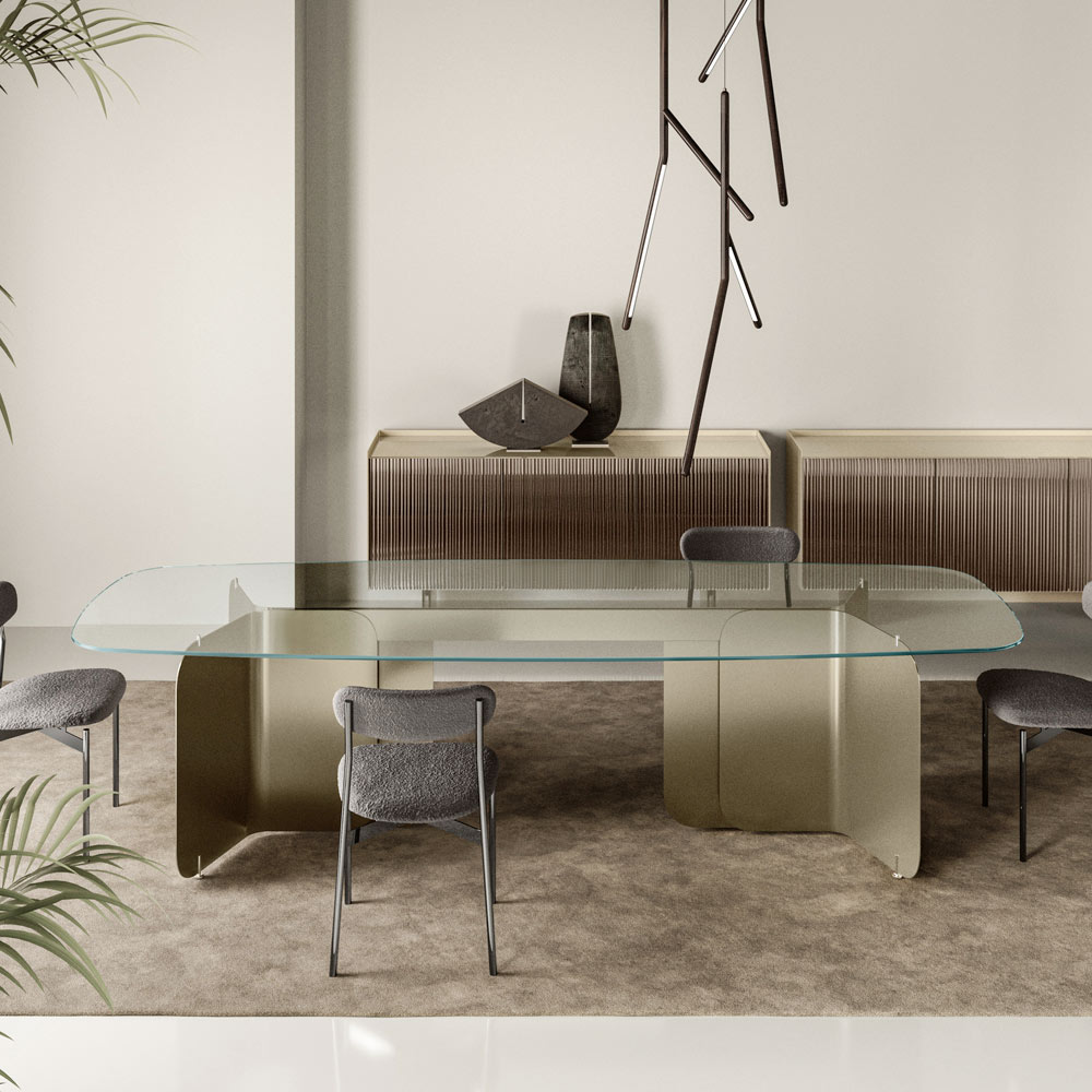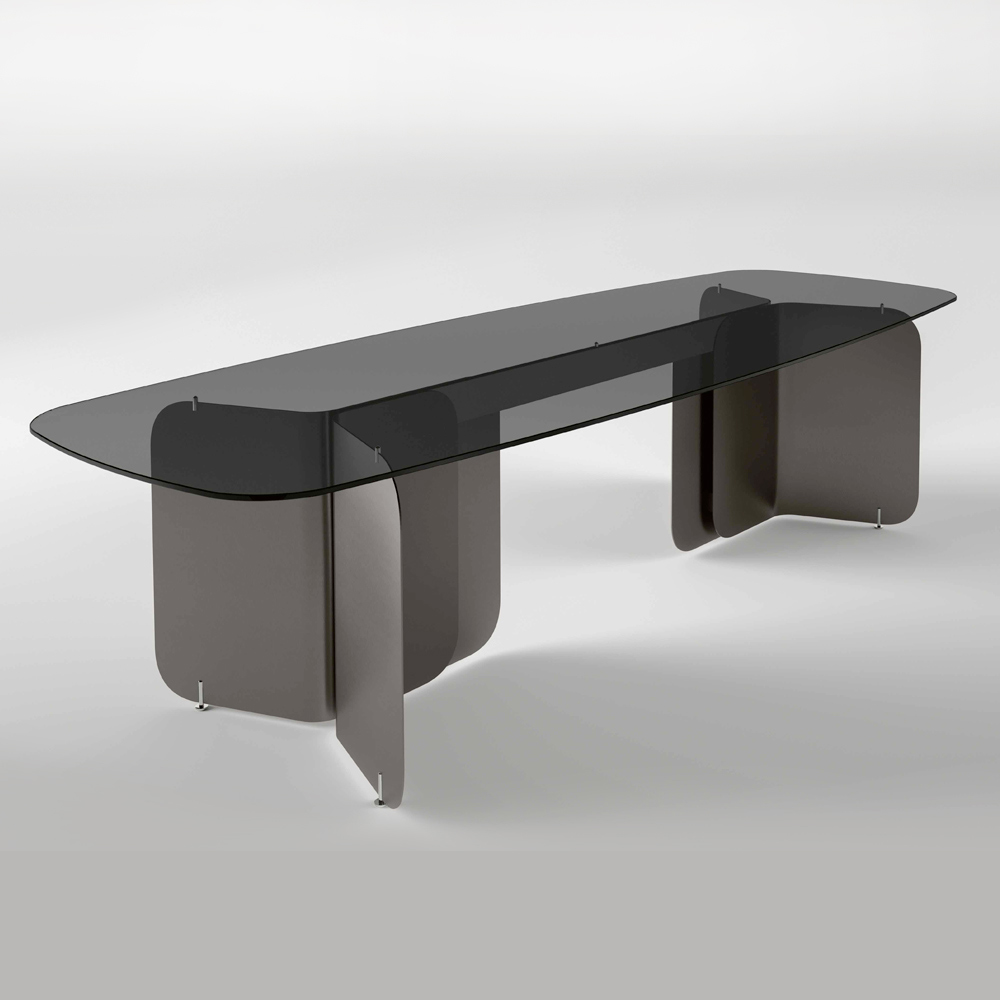 The curved metal bases , with their smooth, flowing shape, lend sturdy stability while adding a touch of modern sophistication . This design makes the table ideal both as a centerpiece in a dining room and as a work table in a study or home office, offering great visual impact and maximum functionality.