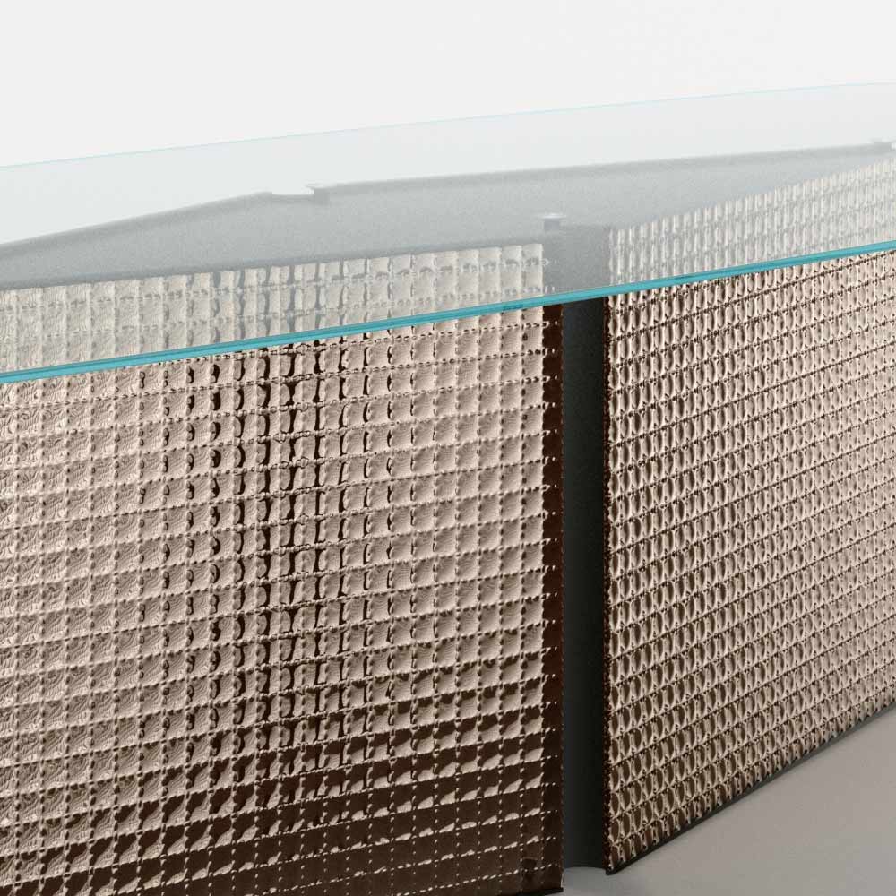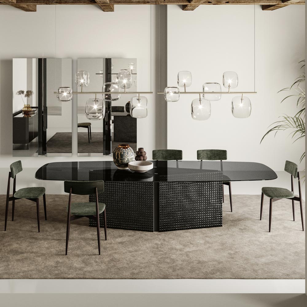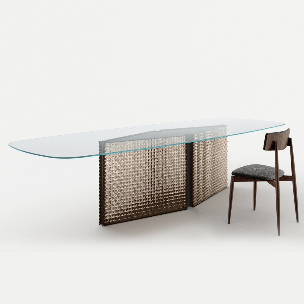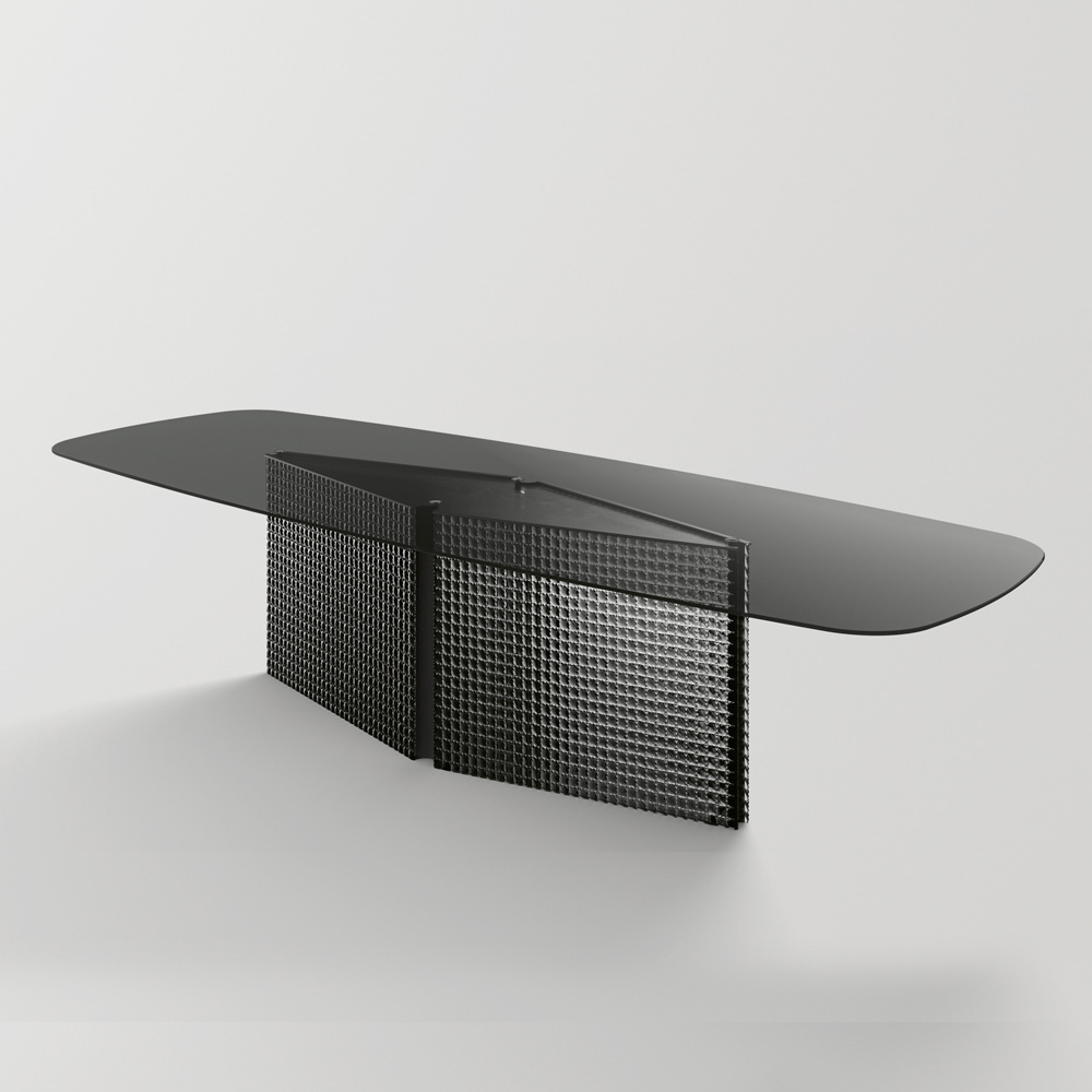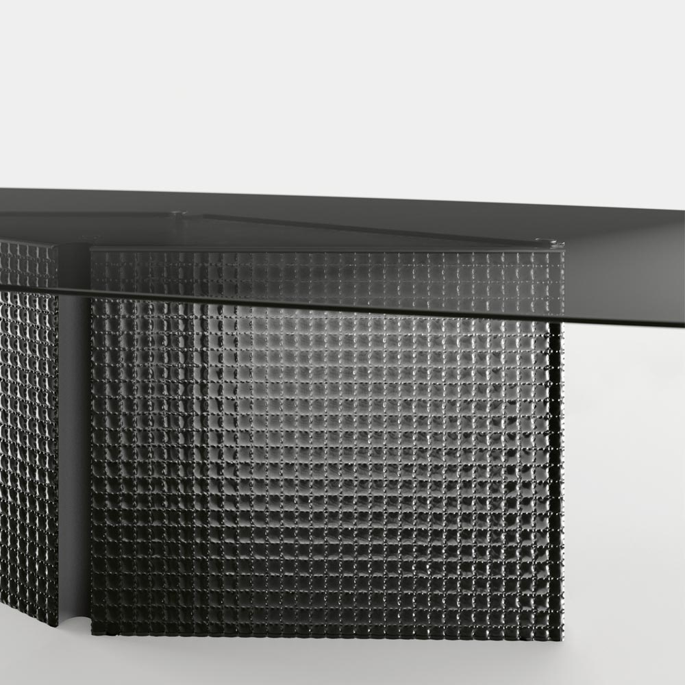 Living room table with shaped tempered glass top fixed to the base by steel plates and central base made up of fused glass elements. The metal structural elements of the base are in a matt black finish. The height- adjustable feet , hidden under the base, allow perfect leveling of the table.