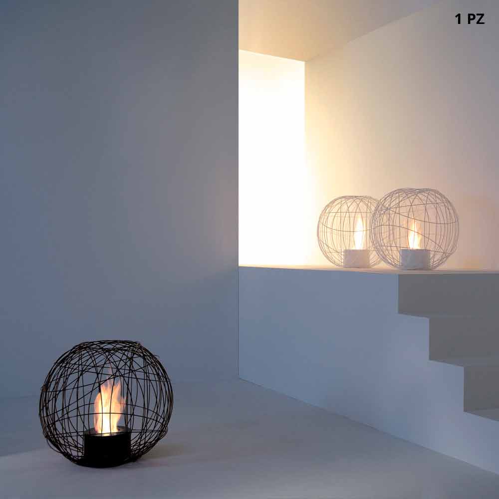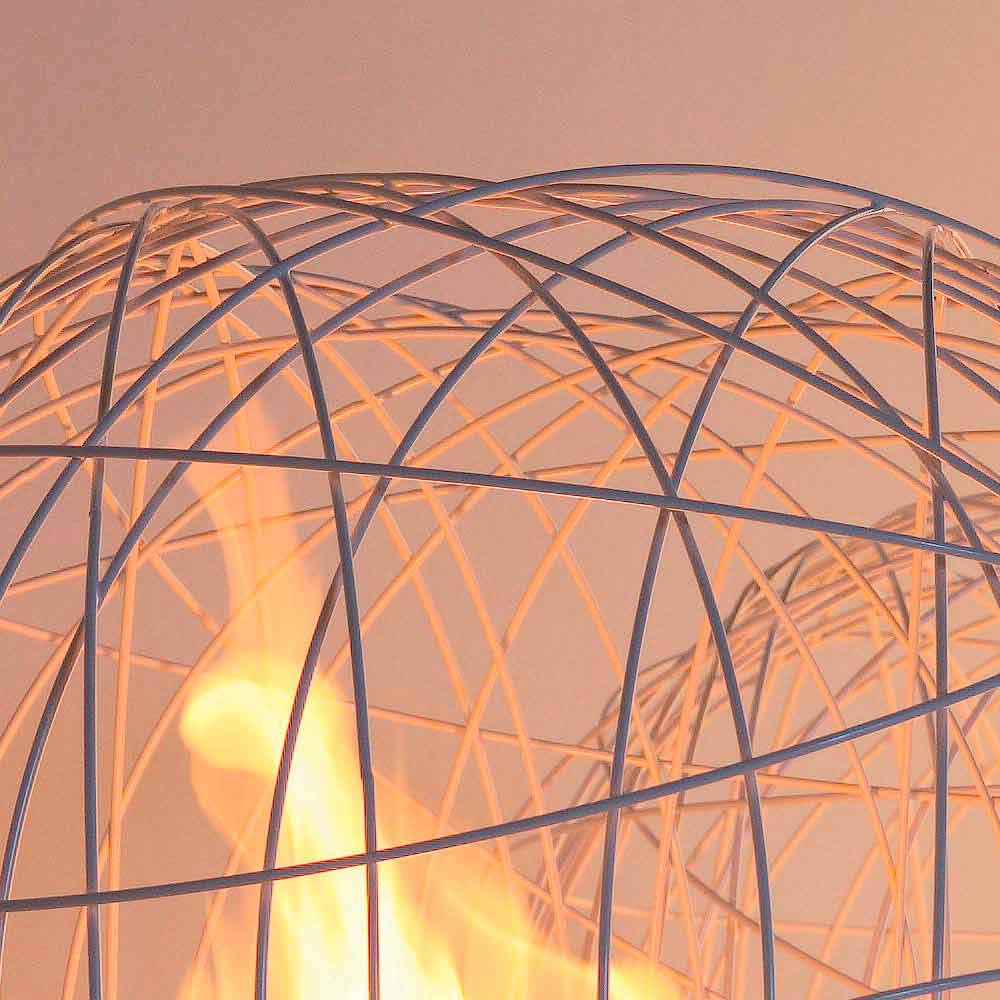 Circles of metal wire welded to each other are the result of this spherical bio.fireplace that protects, almost envelops, the flame in its interior. A unique piece of work. Similar, but different from each other, these objects infuse the environment with a relaxing and peaceful atmosphere.