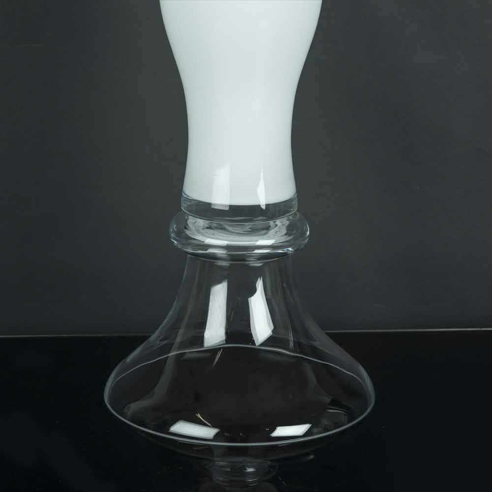 Decorative vase made of white glass with a transparent base through a 100% Made in Italy processing . A refined complement whose structure develops in height proposing a slender figure with soft shapes perfect for furnishing and completing environments with a sophisticated and classy aesthetic thanks also to the timeless elegance of glass, a quality and high value material . An ideal design for the most varied environments, from home furnishings to that of hotels, restaurants, contract areas, spas but also as a setting for events and weddings.