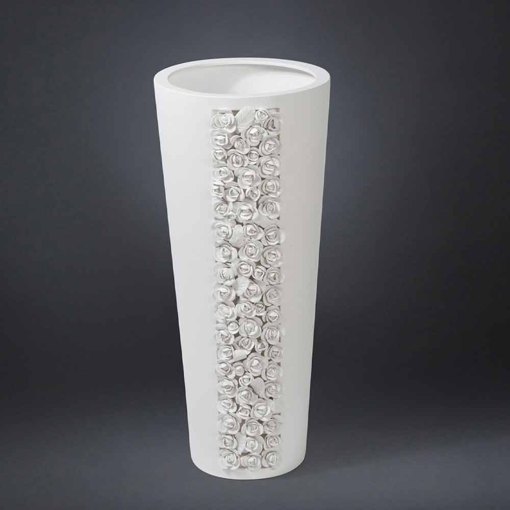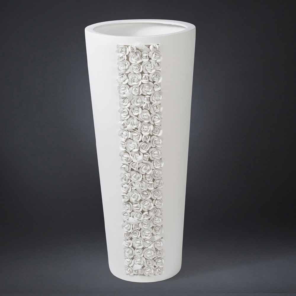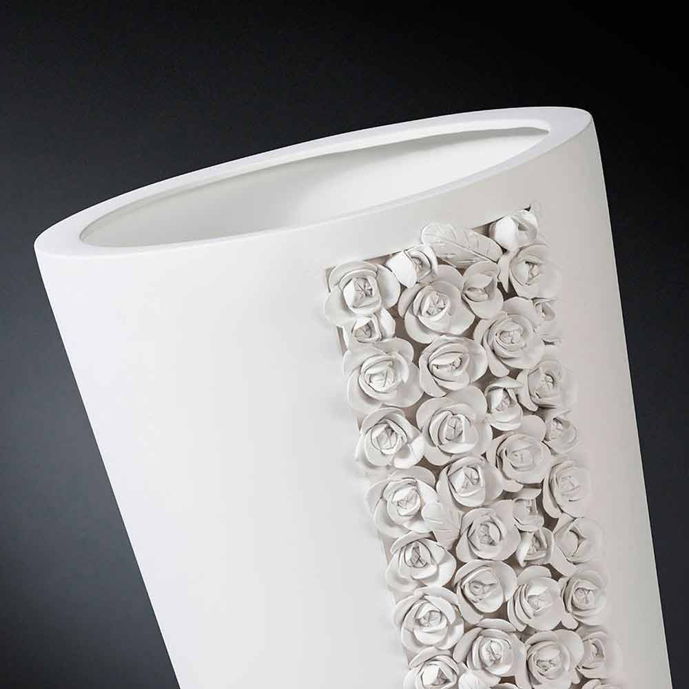 Tall decorative vase made in Italy in opaque white ceramic through an artisanal process . A design punctuated by essential and versatile lines enriched by a wonderful detail with a camellia texture that covers part of the structure of the vase. This detail together with the refined finish chosen give this complement all its elegant personality making it a perfect solution for spaces characterized by a classic and sophisticated style . The use of ceramics and craftsmanship make it an exclusive and refined decorative element, increasing its value and emphasizing its quality. An ideal aesthetic for the most varied environments, from home furnishings to that of hotels, restaurants, contract areas, spas but also as a setting for events and weddings.