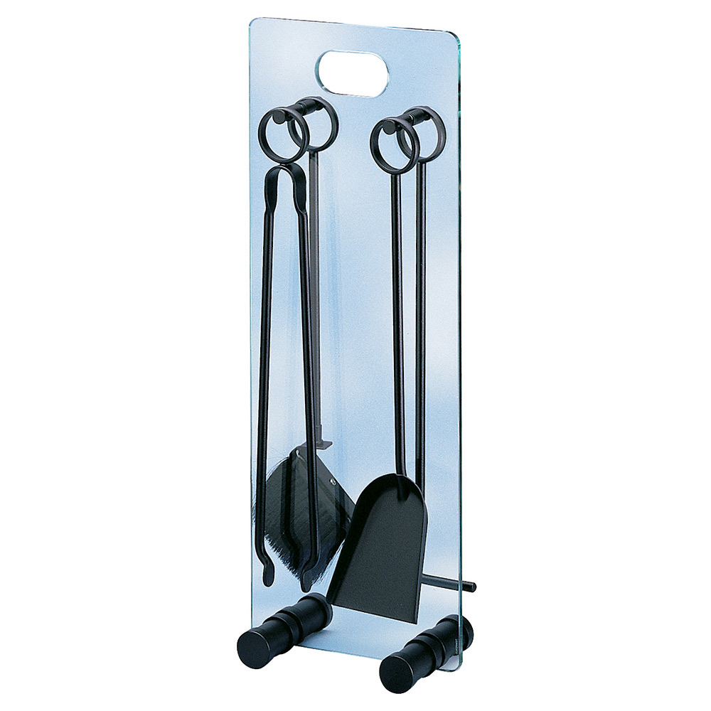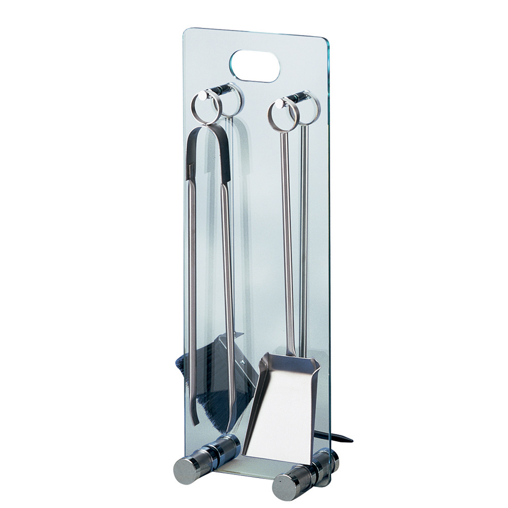 The tool holder includes four essential fireplace accessories : a clamp, a shovel, a hook and a brush . Each tool is designed to offer maximum efficiency and comfort during use, combining practicality with refined aesthetics.
