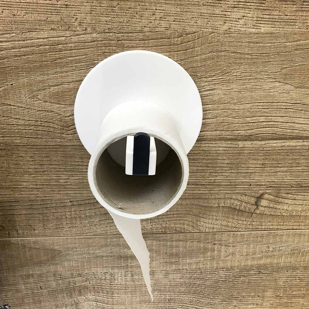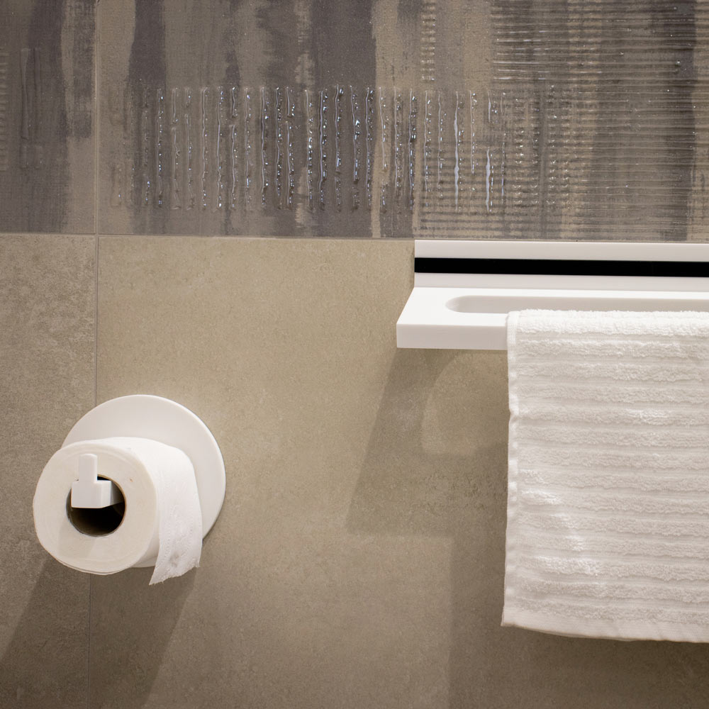 Choose this 6 mm thick toilet roll holder with white front pin and wall protector disc as a bathroom accessory for a modern and luxurious atmosphere entirely made of Corian, a hygienic material with essential lines.