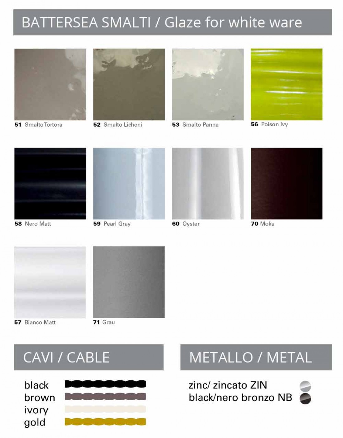 Note: Lamp available in different color variations, both for the external finish and for the power cable and even for the metal spring. View the color chart and indicate the desired color codes in the appropriate box.