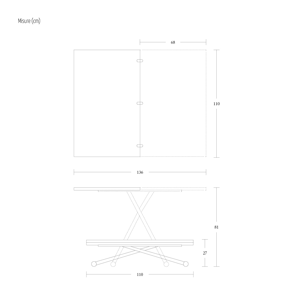 Designed and created especially for those looking for a modern coffee table that can become a practical and functional dining table when needed, it features a book-style top opening and a gas mechanism that allows you to adjust the height to the millimeter from 27 to 81 cm, creating a unique item with a strong personality. Retractable wheels included.