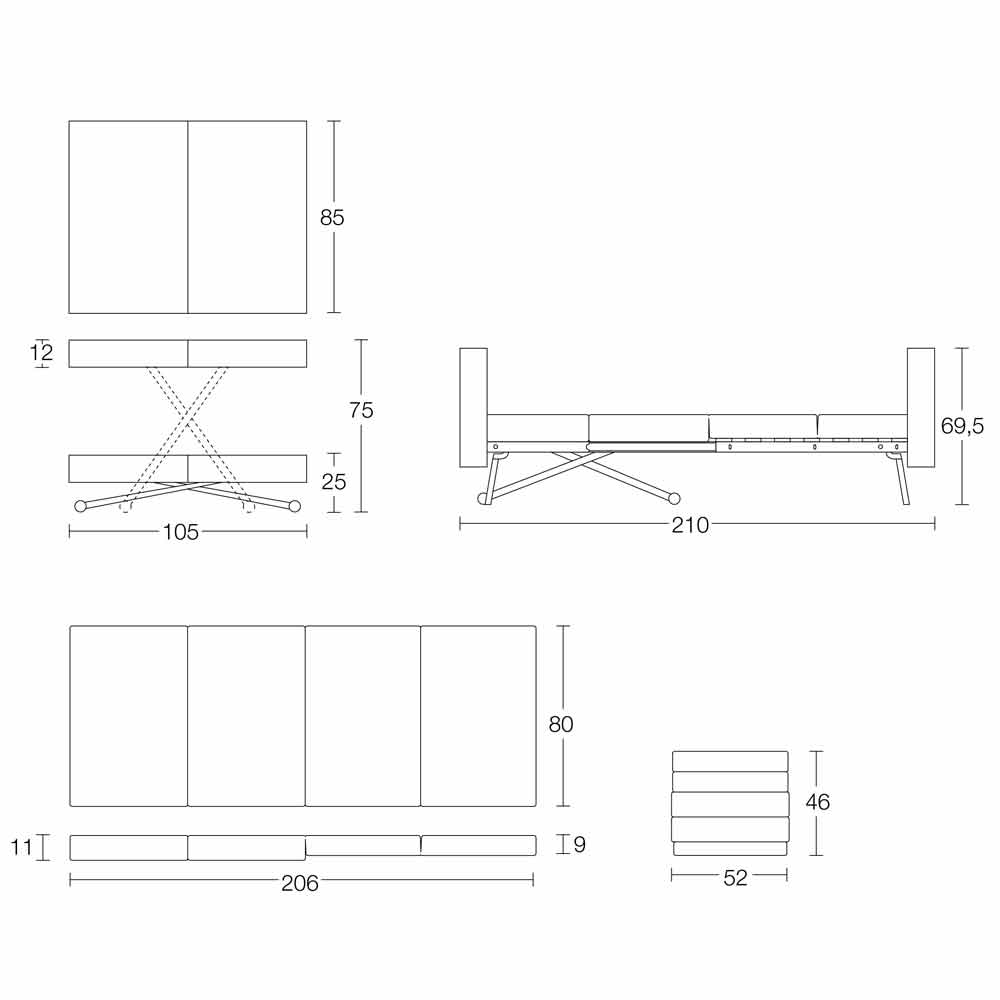This transformable table is characterized by elegant and versatile lines that can move in height to perform the function of a dining table that, when necessary, evolves into a comfortable bed with a refined design. Thanks to the gas mechanism, adjustable in height to the millimetre from 25 cm to 75 cm, it transforms from a coffee table to a dining room or kitchen table, with retractable wheels. Equipped with a pouf that can be transformed into a mattress (D 35 fireproof polyurethane foam), covered in grey fabric. Slatted base and plywood panel. Folding support legs. Table transforms into a 210 cm long bed .