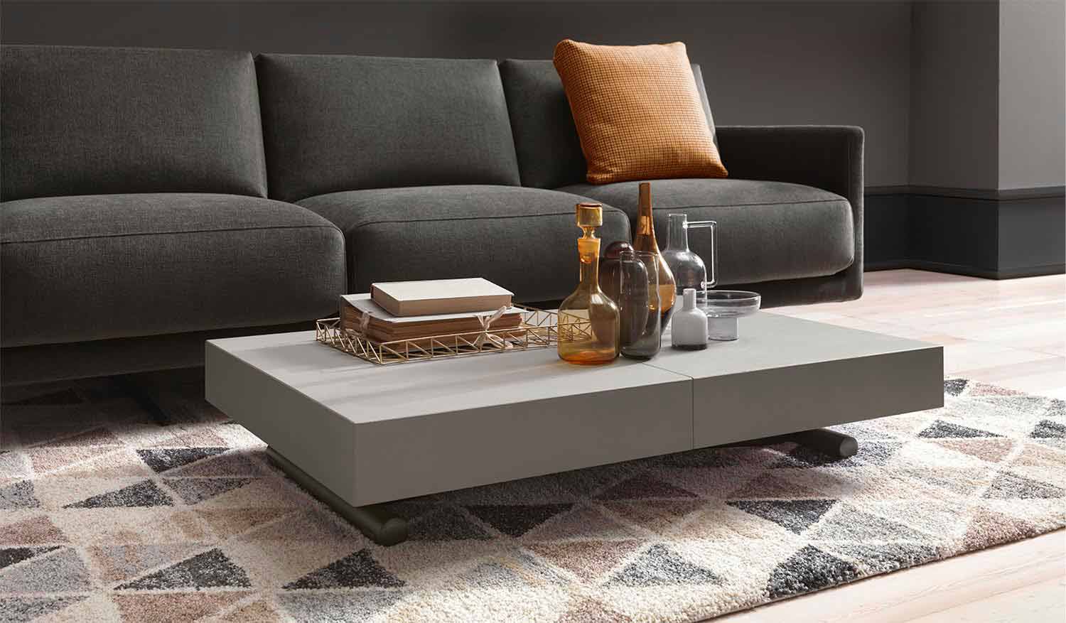 transformable coffee table is outlined by refined and minimal lines capable of furnishing your domestic and contract environments with elegance and practicality.