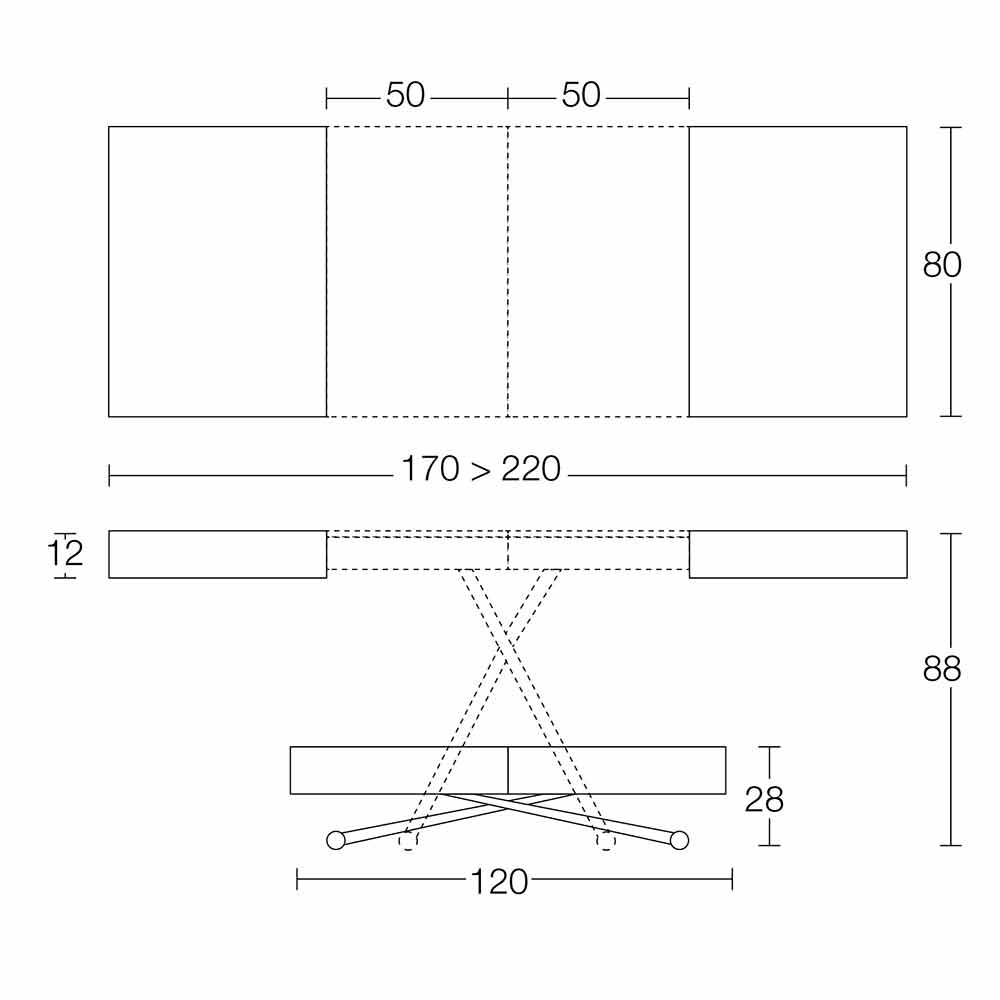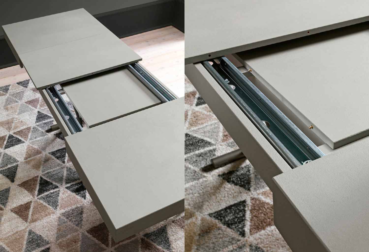 The top is rectangular and extendable through 2 internal extensions of 50 cm each.