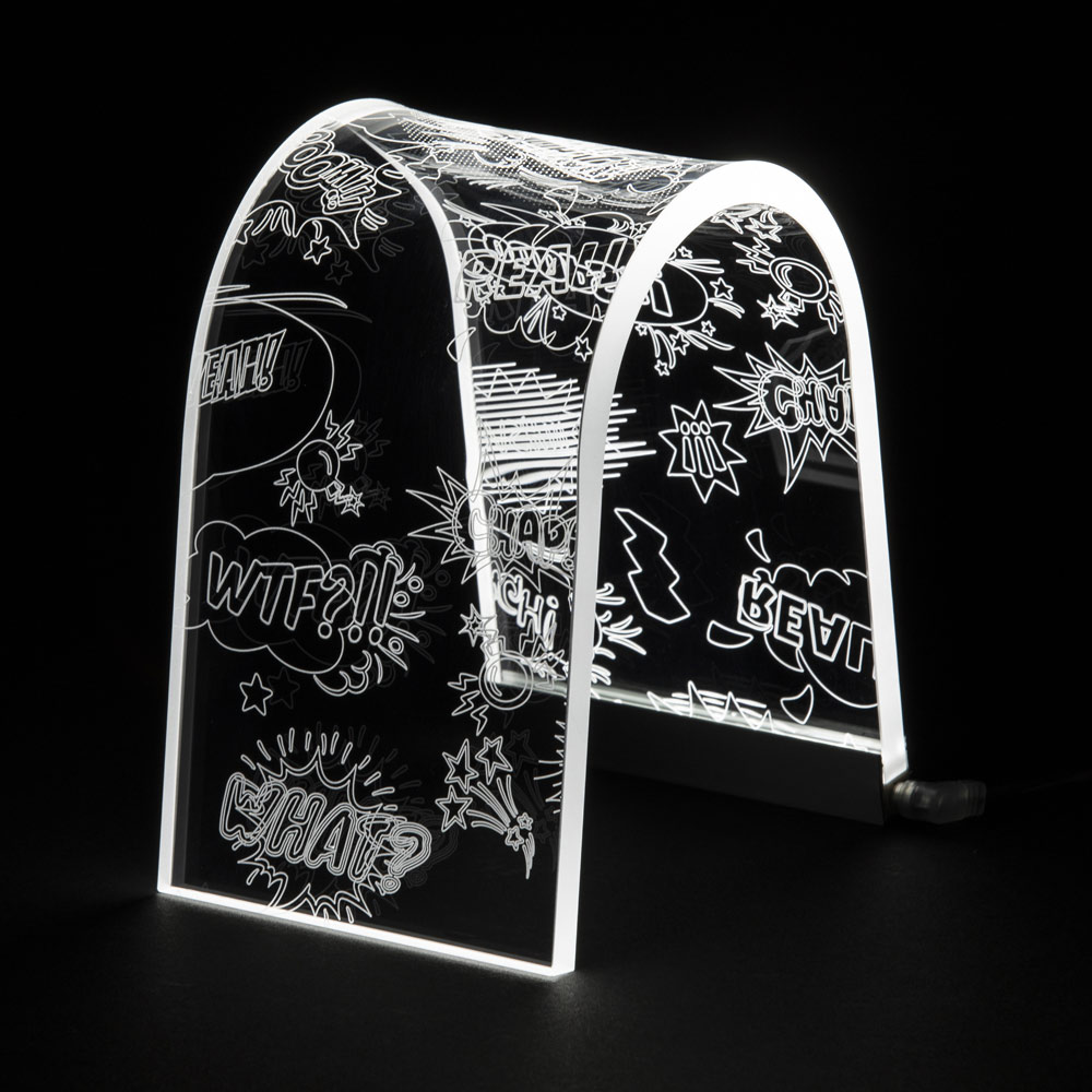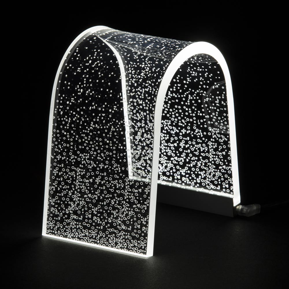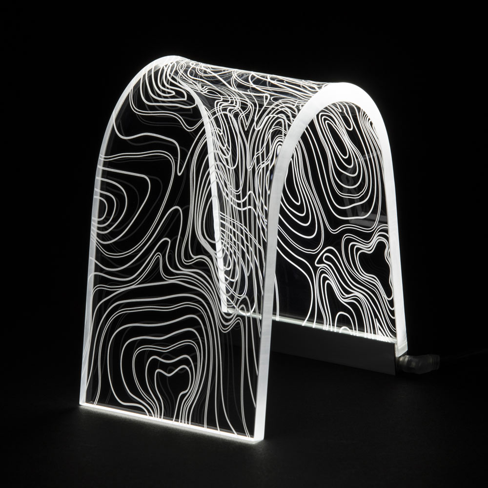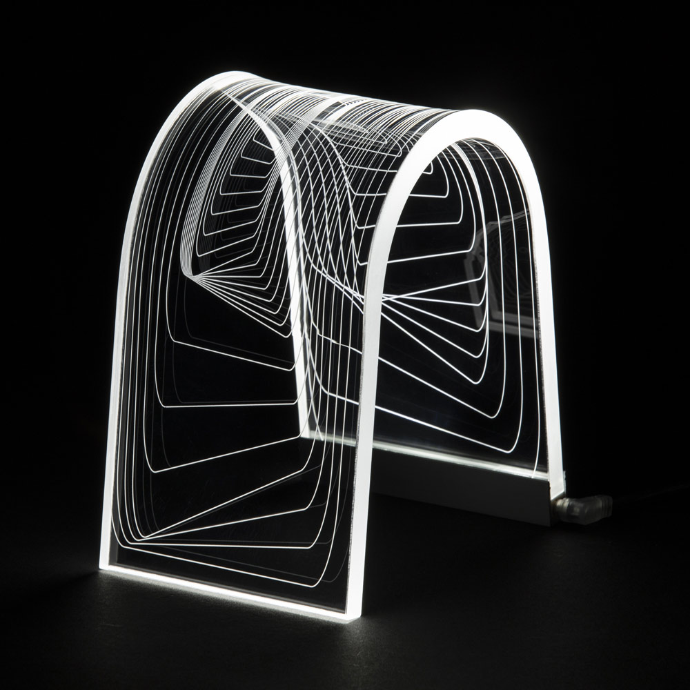 Arch support lamp in acrylic crystal and laser engraved decorations, 2 sizes made in Italy.