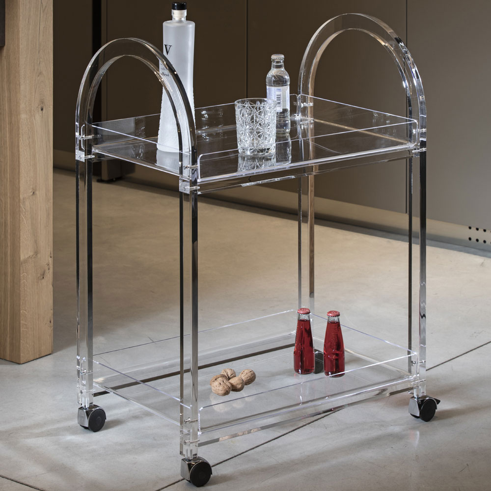 This living room trolley is entirely made of 20 mm thick transparent acrylic crystal with swivel wheels.