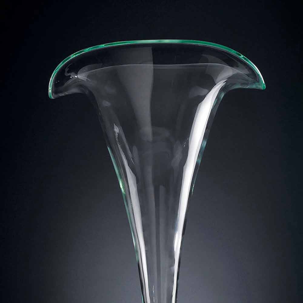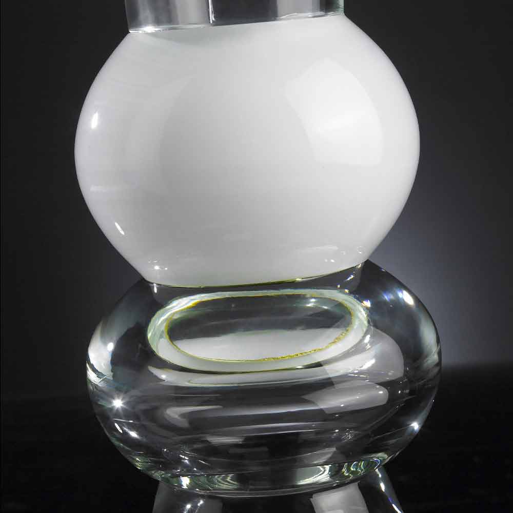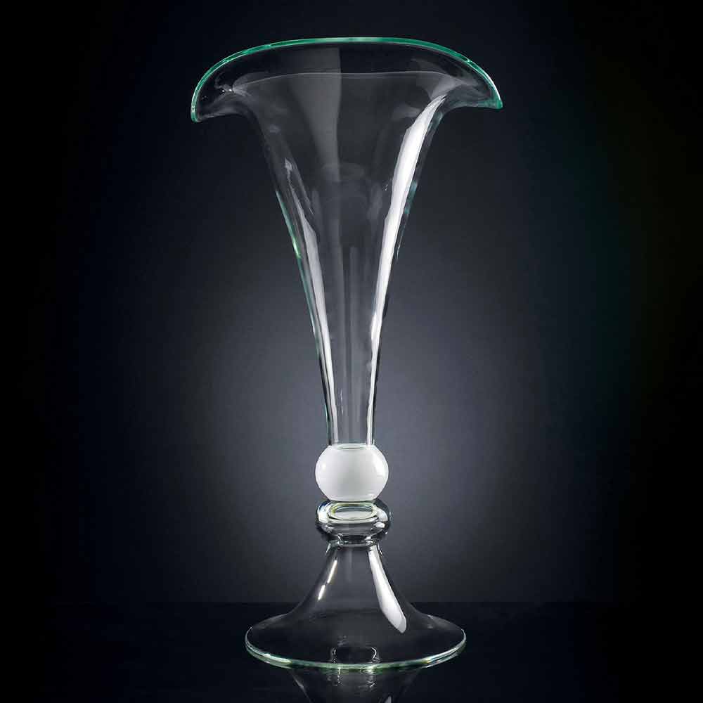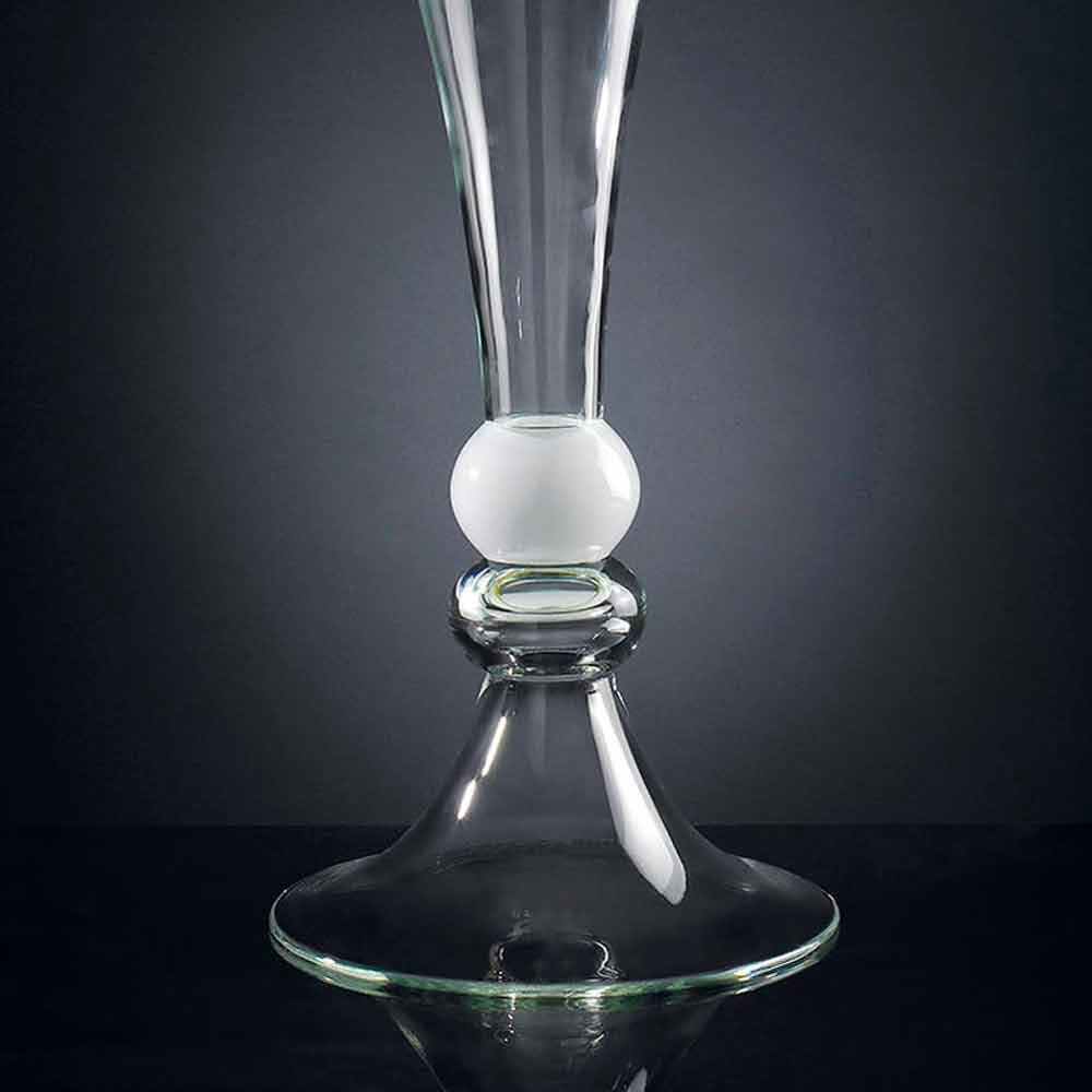 Decorative vase for interiors in transparent glass with white glass sphere handcrafted through a 100% Made in Italy processing . Its peculiarity is represented precisely by the artisan production that increases its value and value to give life to an exclusive and high quality result as well as to a refined and classy complement , characteristics given by the timeless elegance of the glass. An ideal design for the most varied environments, from home furnishings to that of hotels, restaurants, contract areas, spas but also as a setting for events and weddings.