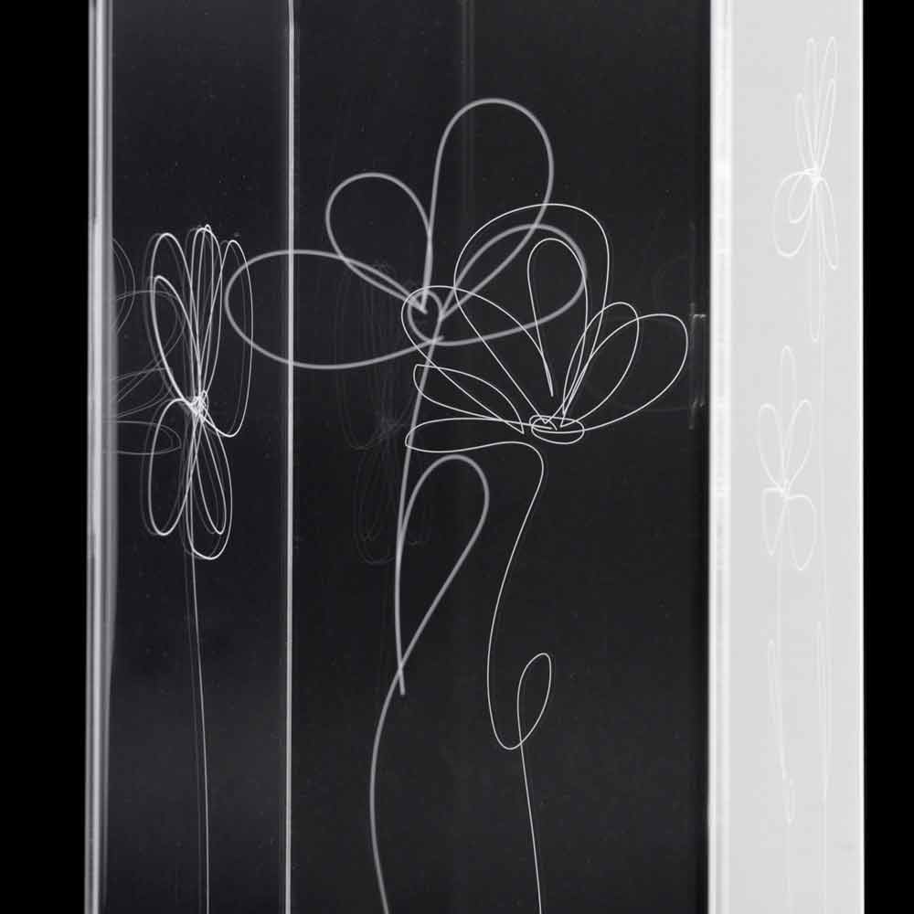 Umbrella stand in transparent plexiglass that is characterized by laser-marked floral decorations with a stylized style with stainless steel base.