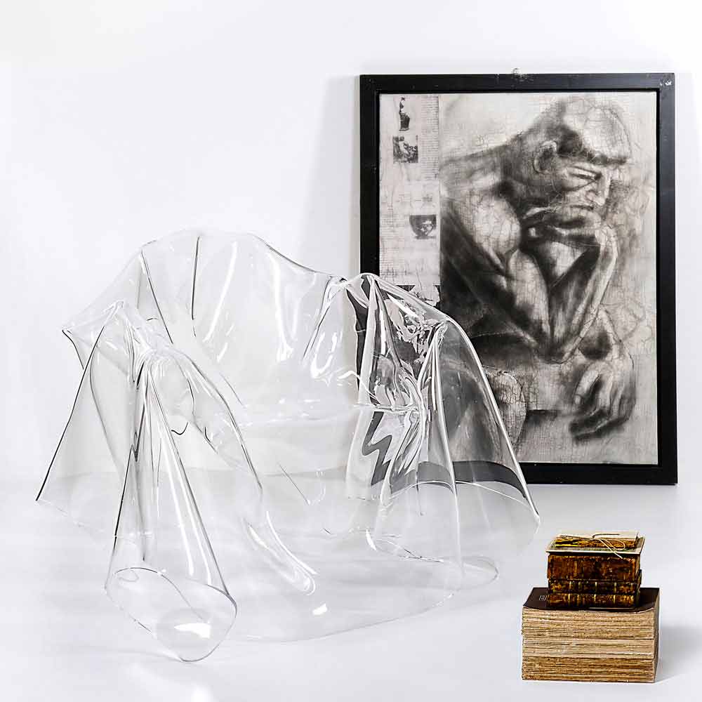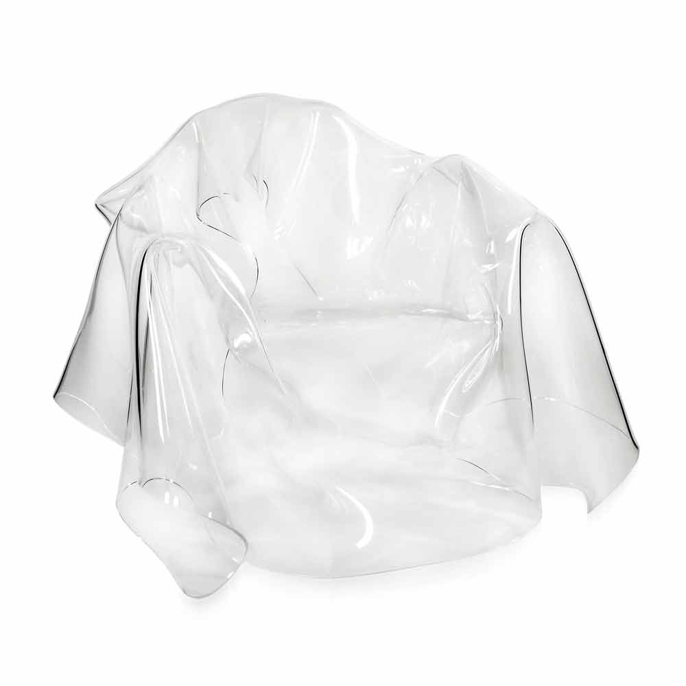 Each "Paris" armchair is a unique modern art piece. From a 100% pure PMMA transparent plexiglass sheet hand-draped, comes a unique armchair. Self-supporting, the armchair can accommodate 1 seater.