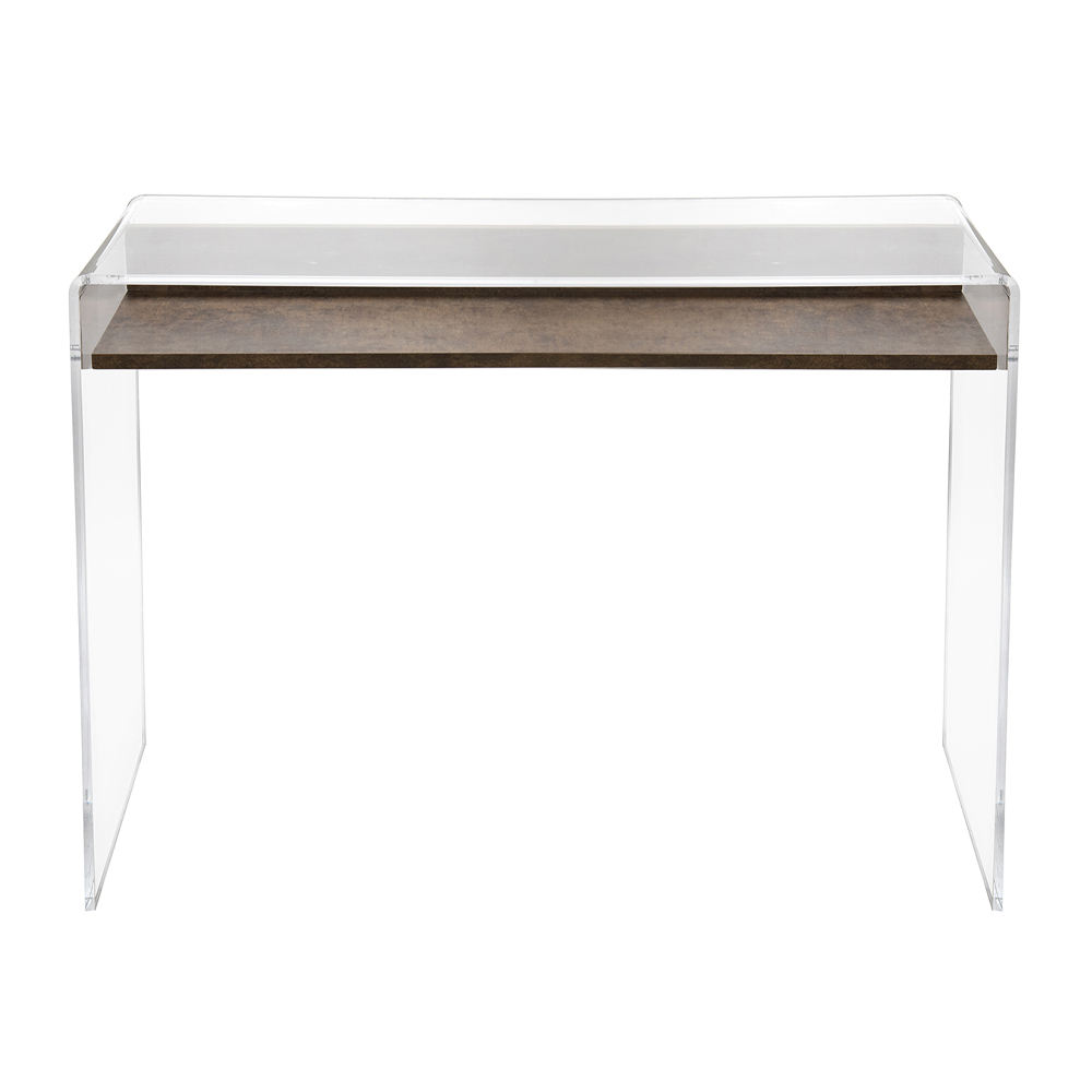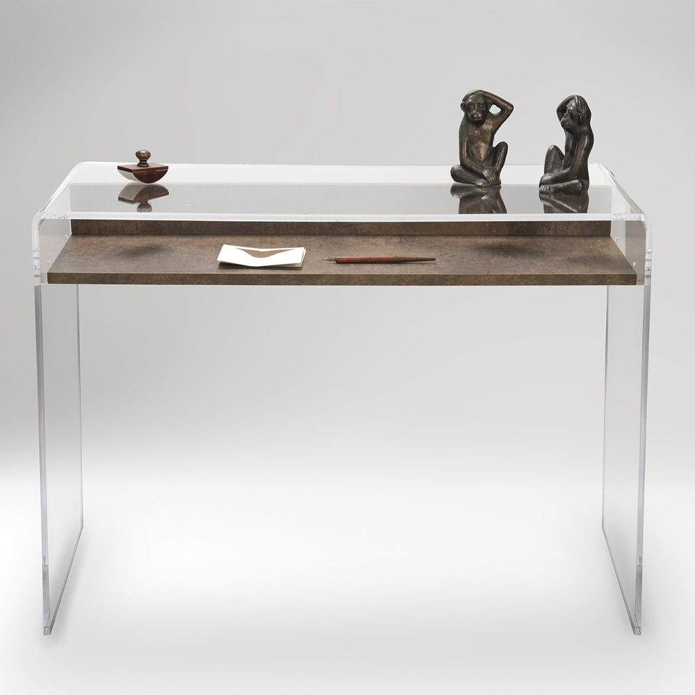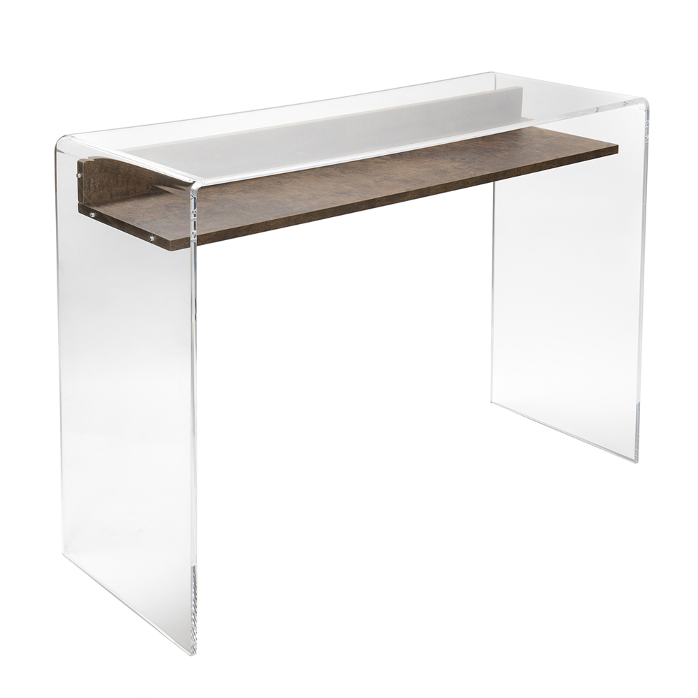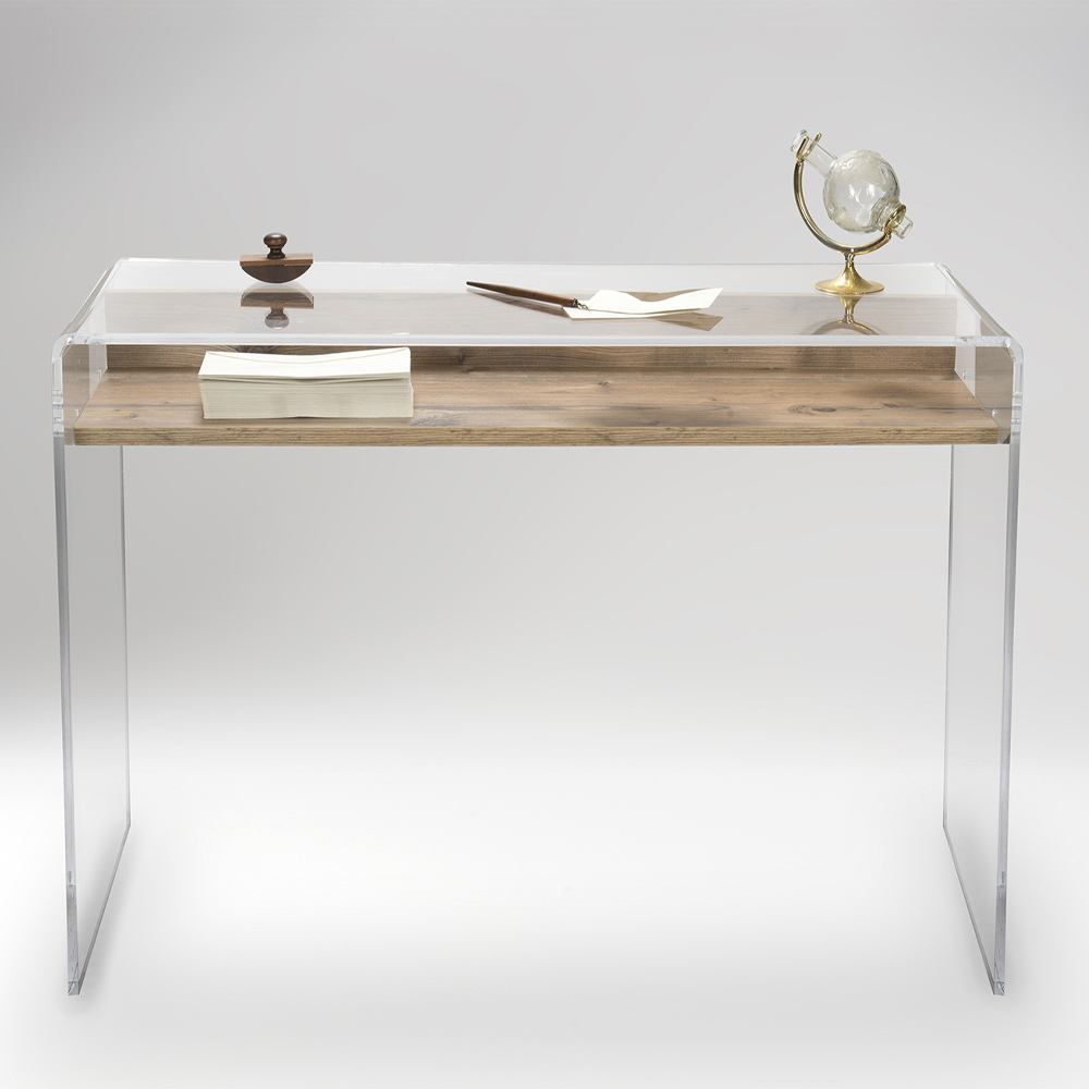 Modern design console in laser-cut transparent plexiglass with wooden shelf, design made in Italy.