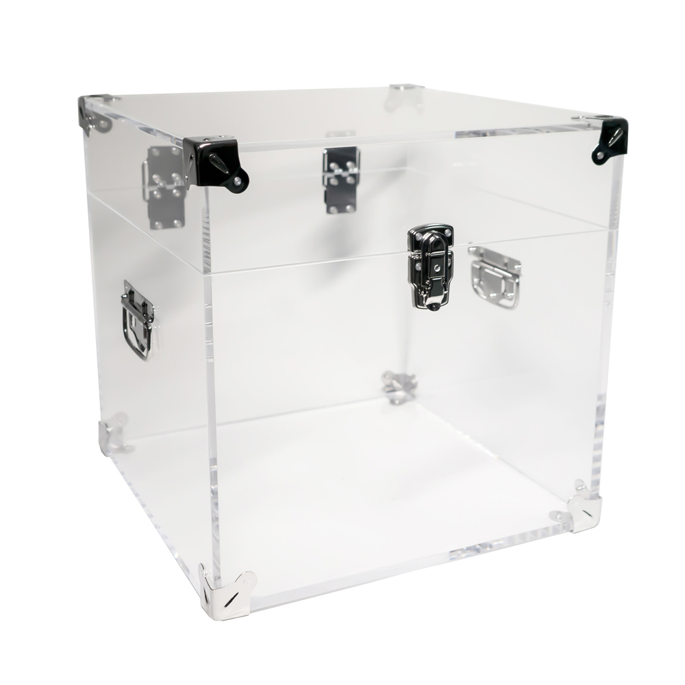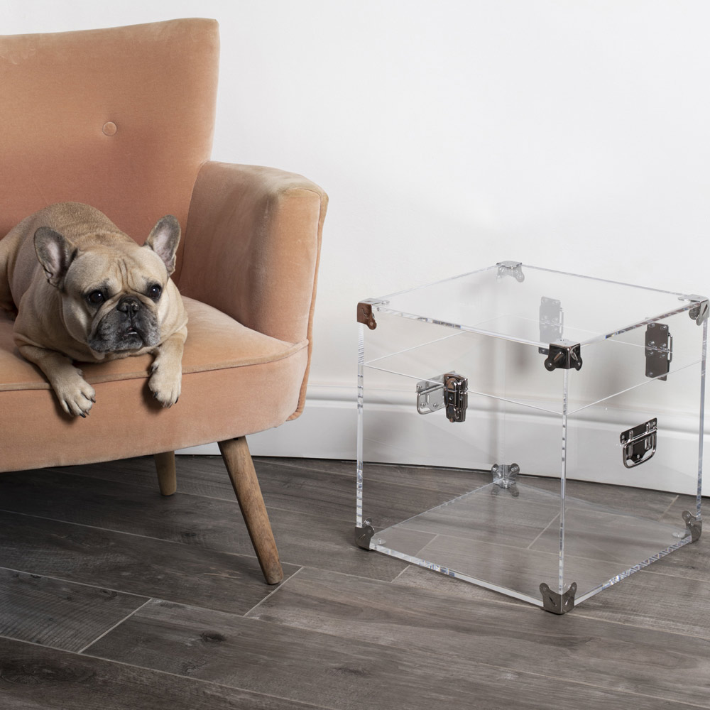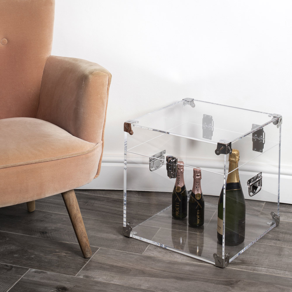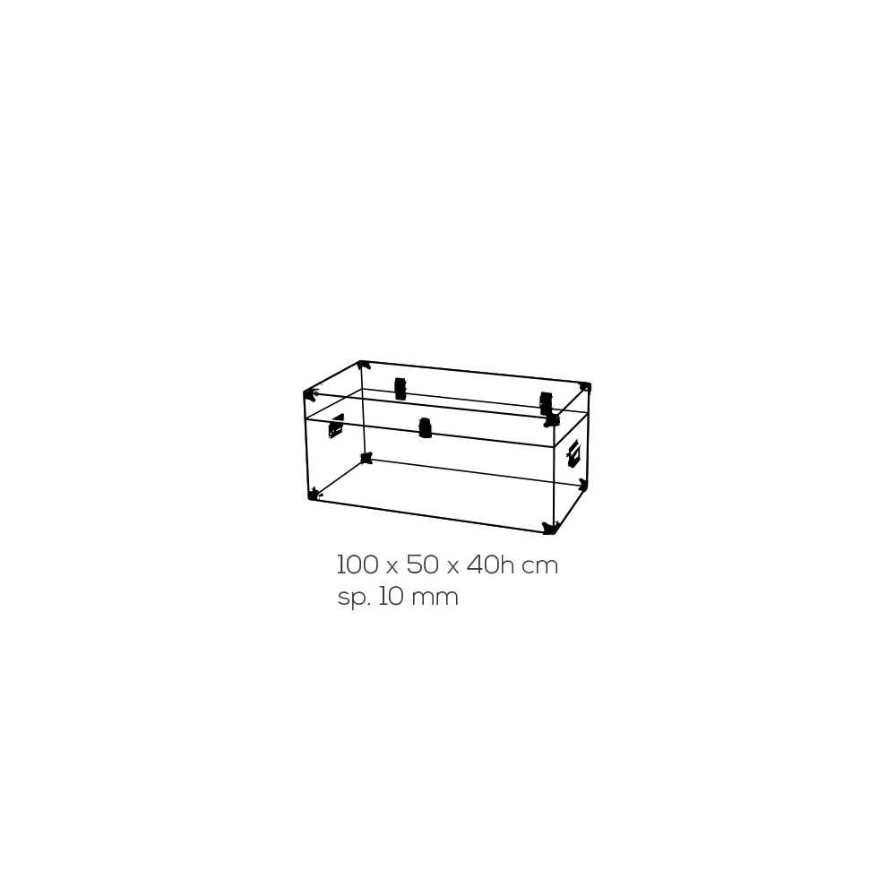 This trunk is entirely made of folded acrylic crystal available in 2 variants with a thickness of 10 mm, entirely UV glued with precious chromed steel finishes.