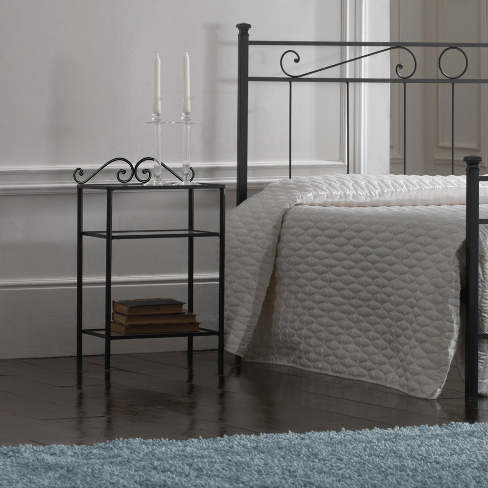 Bedside table made with tubular iron structure in powder-coated finish and 3 glass shelves.