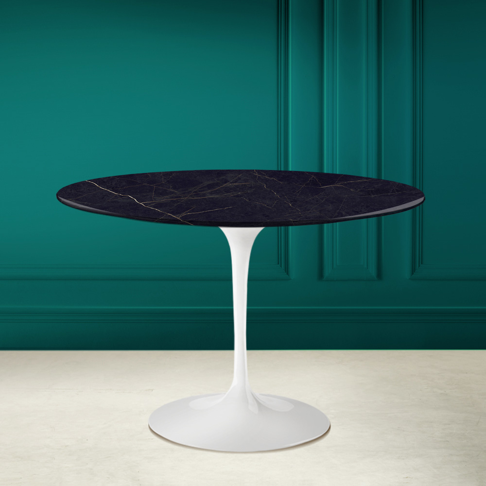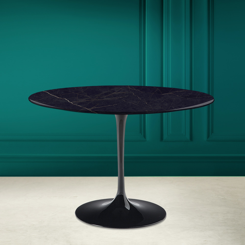 Dining table with round top in noir laurent ceramic and base in polished aluminum Made in Italy