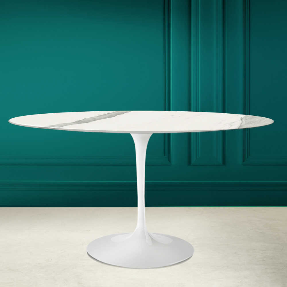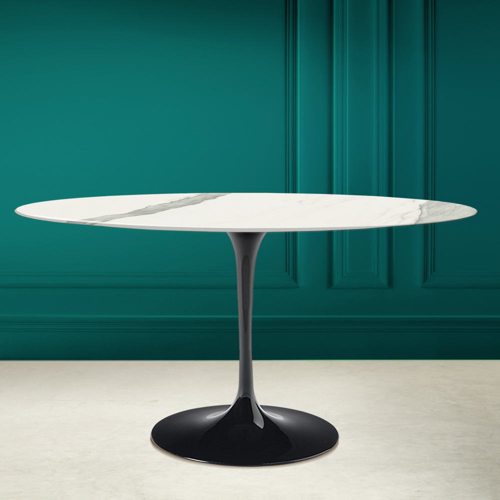 polished aluminum base. This table is the perfect element to give an original touch to any living room and kitchen thanks to the oval shape and statuario fulvein ceramic. The