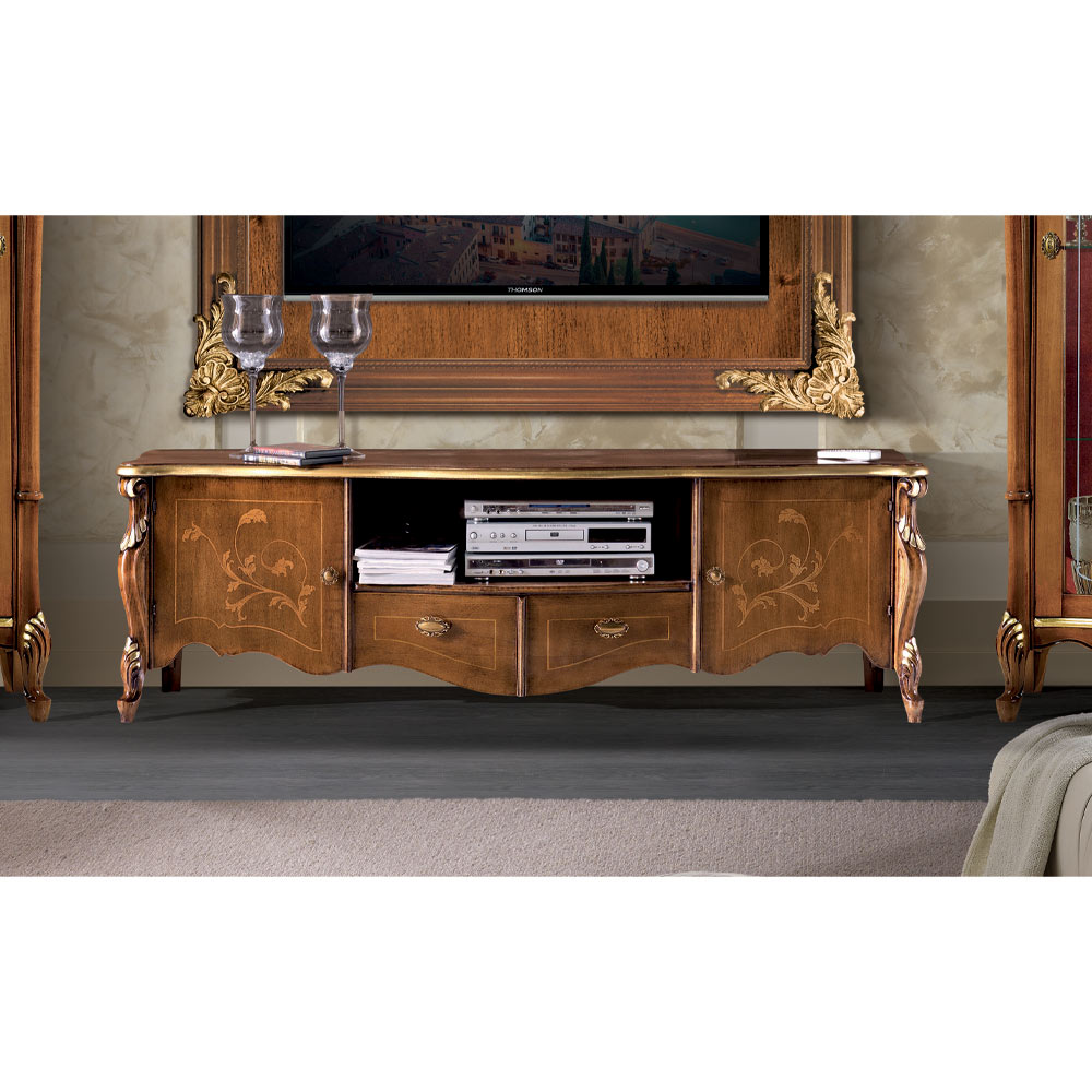 Classic-style living room TV stand with 2 doors, 2 drawers, and 1 compartment, crafted from Bassano walnut with antique gold details. A unique and refined piece, entirely crafted in Italy by skilled master craftsmen , masters of art who expertly and elegantly finish each piece. Production is carried out using high-quality materials and handcrafted with the utmost care and professionalism that distinguishes Made in Italy products.