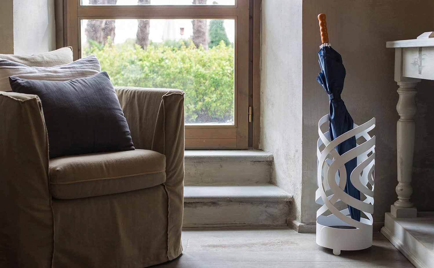 umbrella stand is outlined by particular lines recalling the shape of intertwined ribbons.