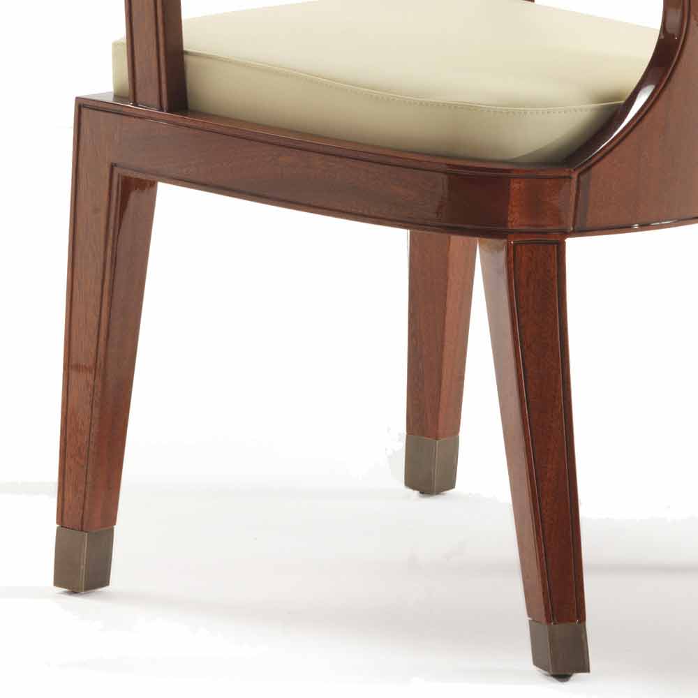 The front of the back is in smooth wood, while the back is in worked wood. The seat is padded and covered in leather, the tips are in bronzed brass. Finish in polished mahogany.