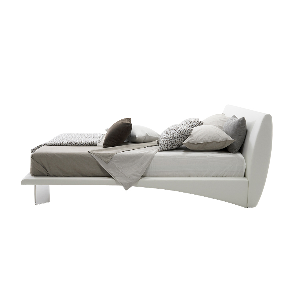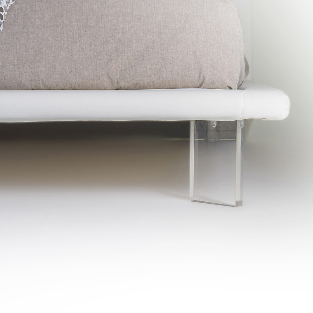 Peculiar features are the double perimeter stitching of the headboard and bed frame and the plexiglass feet that create the suspended effect.