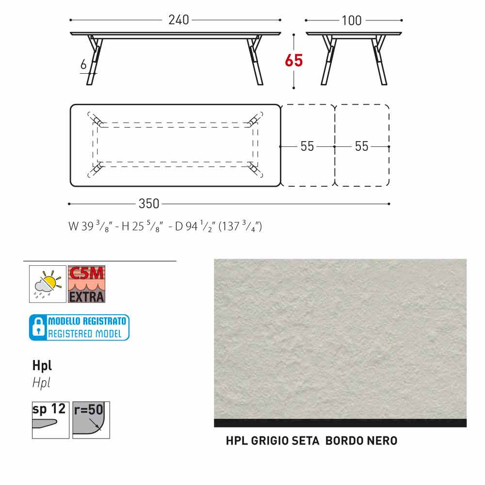 HPL technical features : High-pressure laminates. They are made of several layers of paper (70%) impregnated with thermosetting resins (30%) and compacted for about 45-50 minutes through the combined action of heat ( at about 150 degrees) and high pressure (greater than 7 MPa / Megapascal per square meter.) The result is a stable, nonreactive, non-porous and high-density product. It has physical and chemical features of high mechanical strength (controlled temperature excursion +80/-40 degrees, for less than 30 seconds at extreme temperatures). It resists to light exposure and temperature variations, even in marine environments.