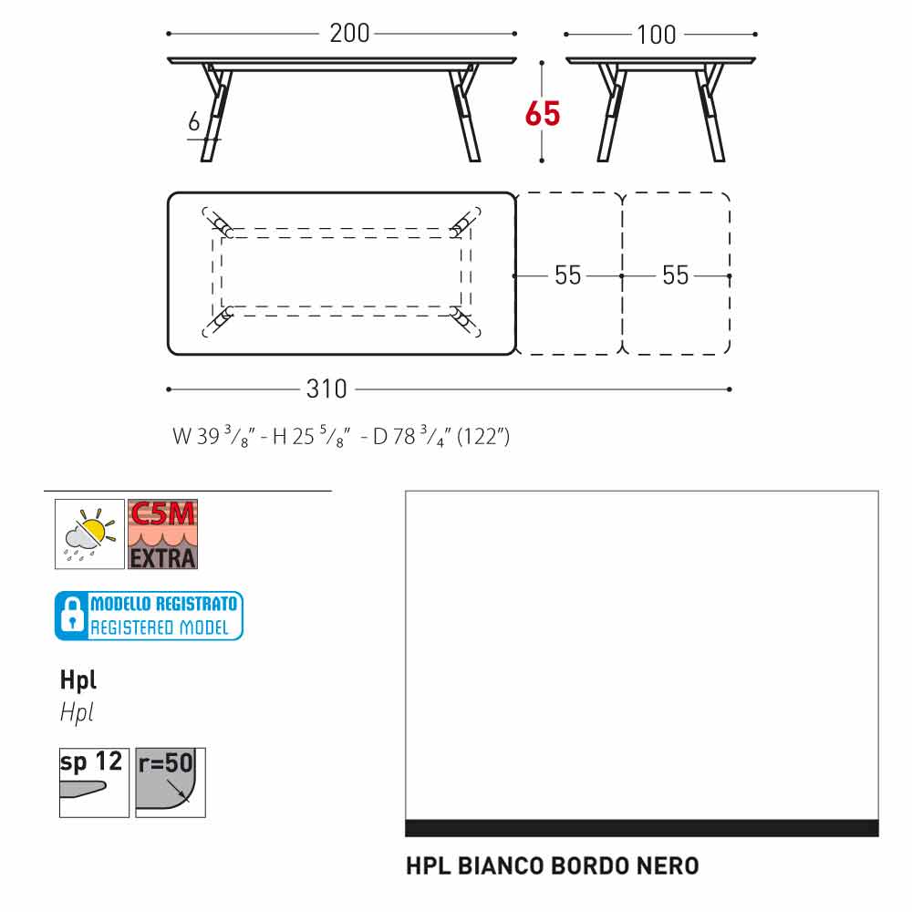 100x200/310xH65 cm - 2 extension leaves 55 cm ciascuna