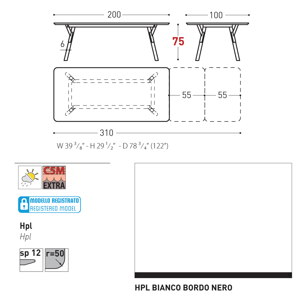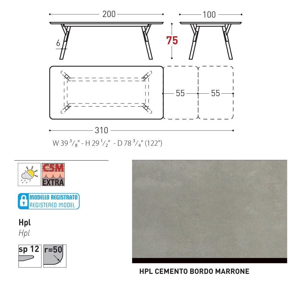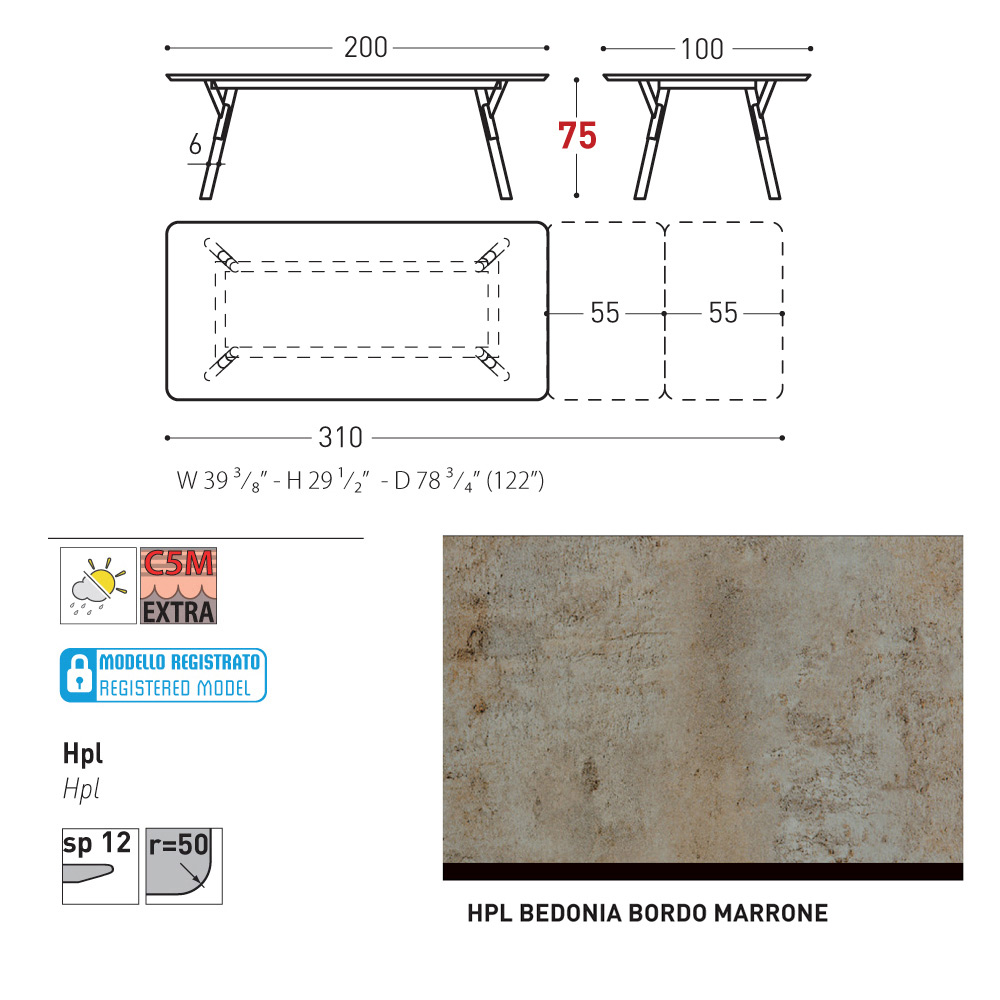 100x200/310xH73.2 cm - 2 extension leaves of 55 cm each