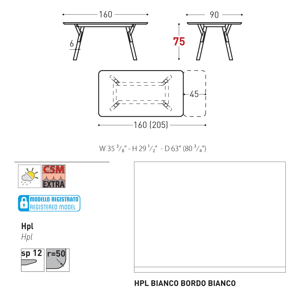 90x160/205x H 73.2 cm - 1 extension of 45 cm