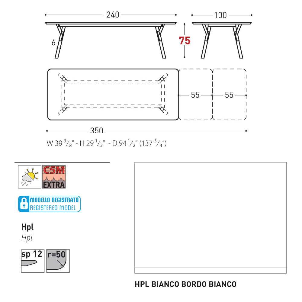 100x240/350x73.2cm - 2 extension leaves of 55 cm each