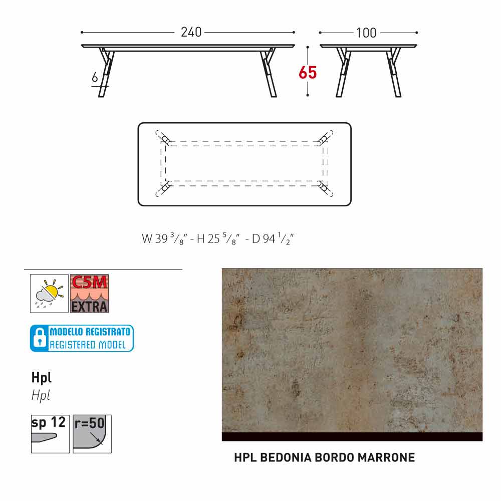 HPL technical features : High-pressure laminates. They are made of several layers of paper (70%) impregnated with thermosetting resins (30%) and compacted for about 45-50 minutes through the combined action of heat ( at about 150 degrees) and high pressure (greater than 7 MPa / Megapascal per square meter.) The result is a stable, nonreactive, non-porous and high-density product. It has physical and chemical features of high mechanical strength (controlled temperature excursion +80/-40 degrees, for less than 30 seconds at extreme temperatures). It resists to light exposure and temperature variations, even in marine environments.