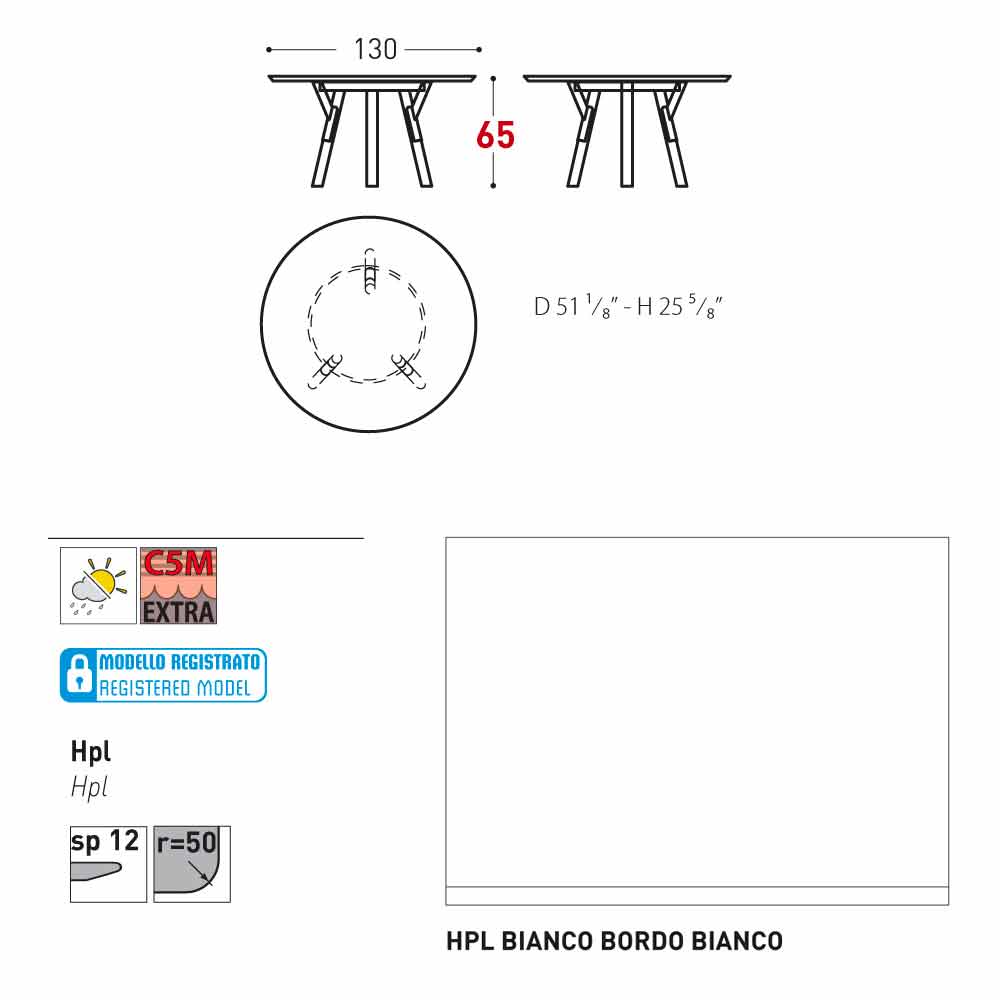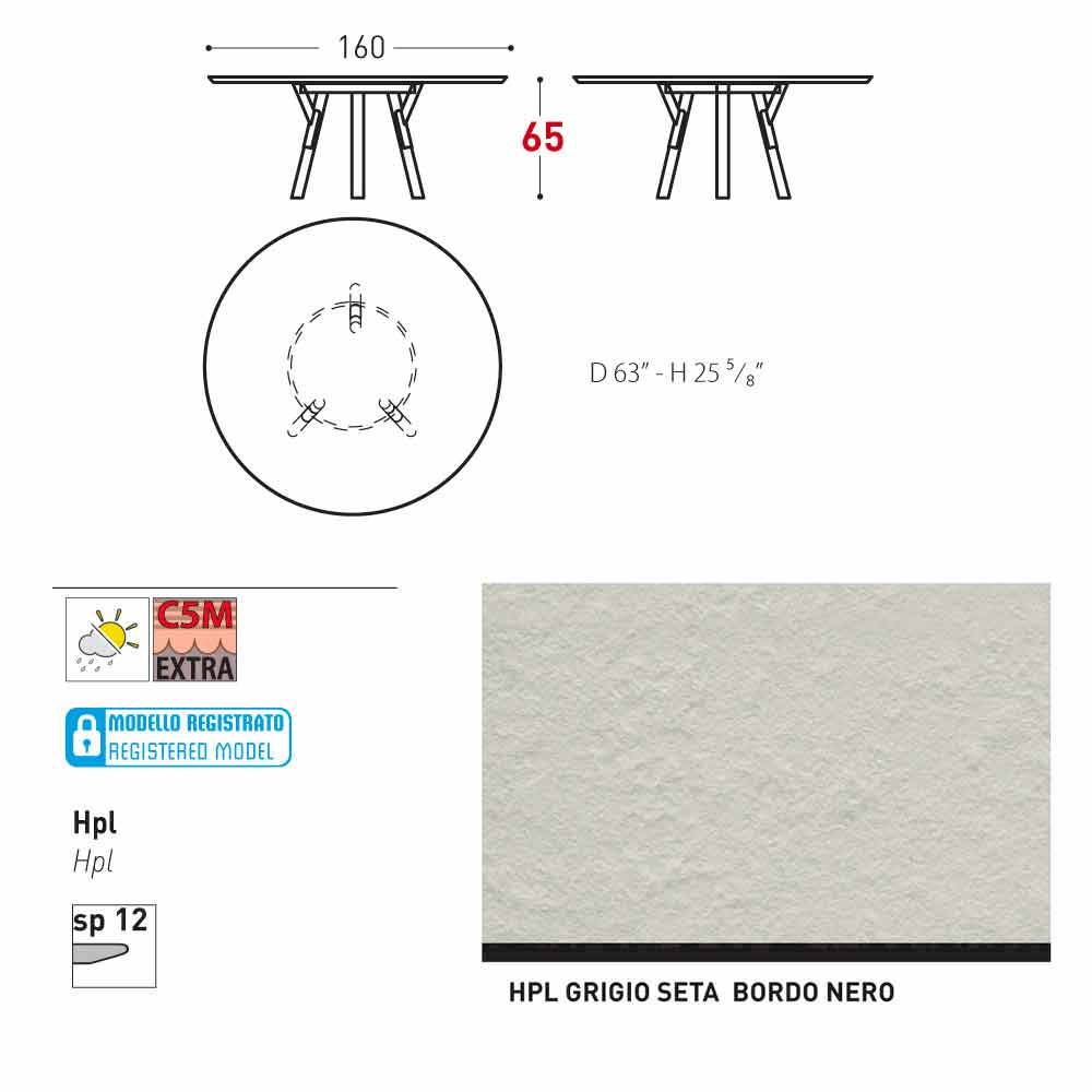 HPL technical features : High-pressure laminates. They are made of several layers of paper (70%) impregnated with thermosetting resins (30%) and compacted for about 45-50 minutes through the combined action of heat ( at about 150 degrees) and high pressure (greater than 7 MPa / Megapascal per square meter.) The result is a stable, nonreactive, non-porous and high-density product. It has physical and chemical features of high mechanical strength (controlled temperature excursion +80/-40 degrees, for less than 30 seconds at extreme temperatures). It resists to light exposure and temperature variations, even in marine environments.