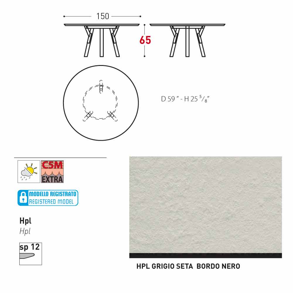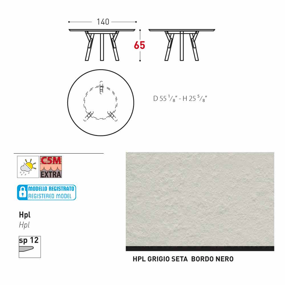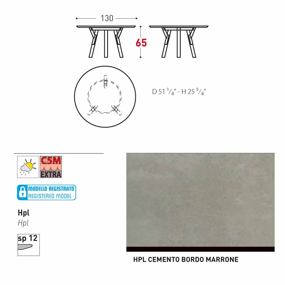 The modern design table Link has a painted stainless steel frame and teak wood legs. The top is made of HPL (12 mm thick). Thanks to its versatile design, you can use it both in the garden, in the patio or indoor. You can customize the round garden table Link by choosing between the available dimensions and finishes.