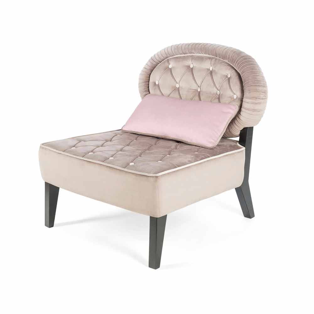 Elizabeth has a smooth velvet cover in the taupe colour. The cushions are decorated with buttoned upholstery.