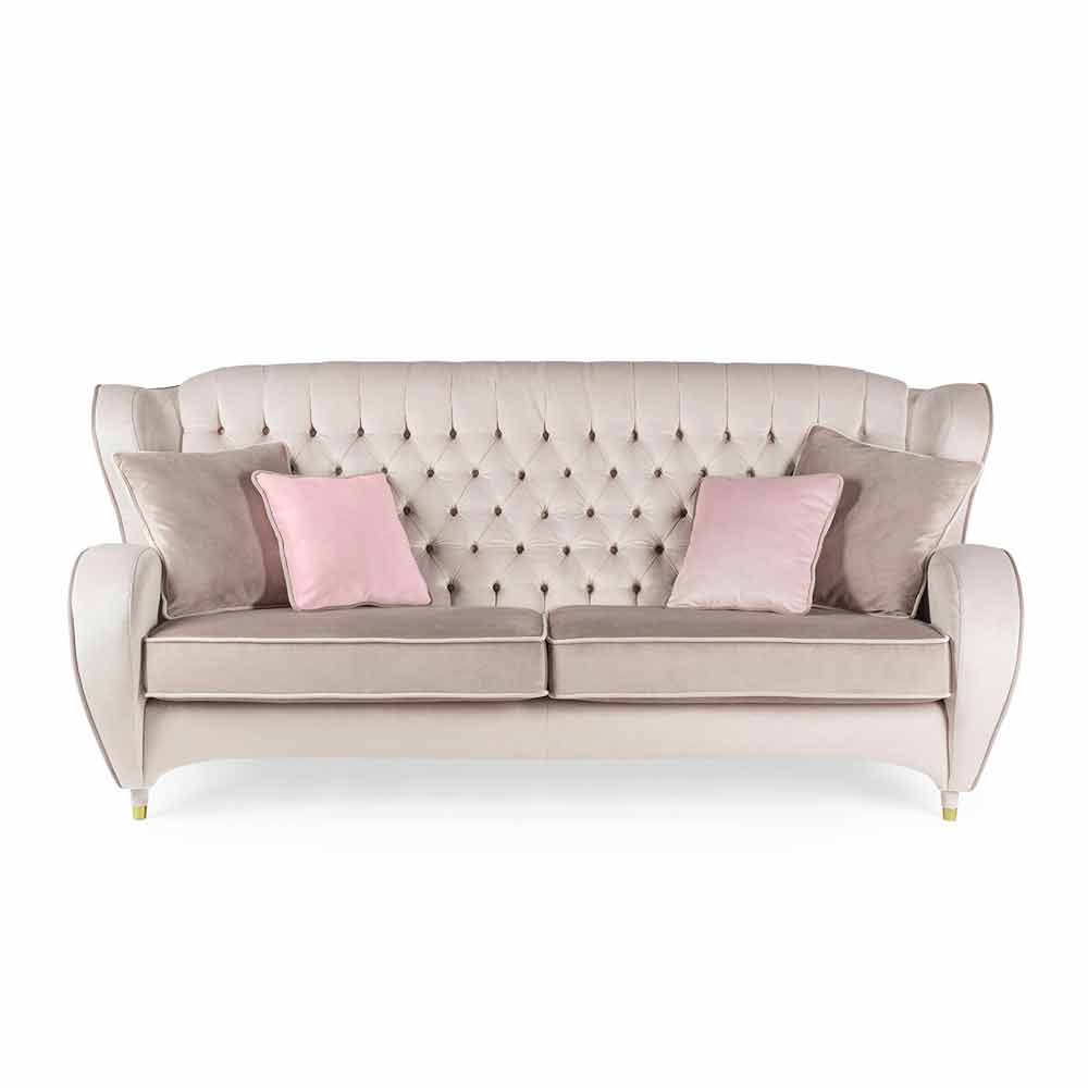 Schinke has a velvet cover in the shades Ecru, taupe and with Canaletto edges. High back cushion decorated with buttoned upholstery.