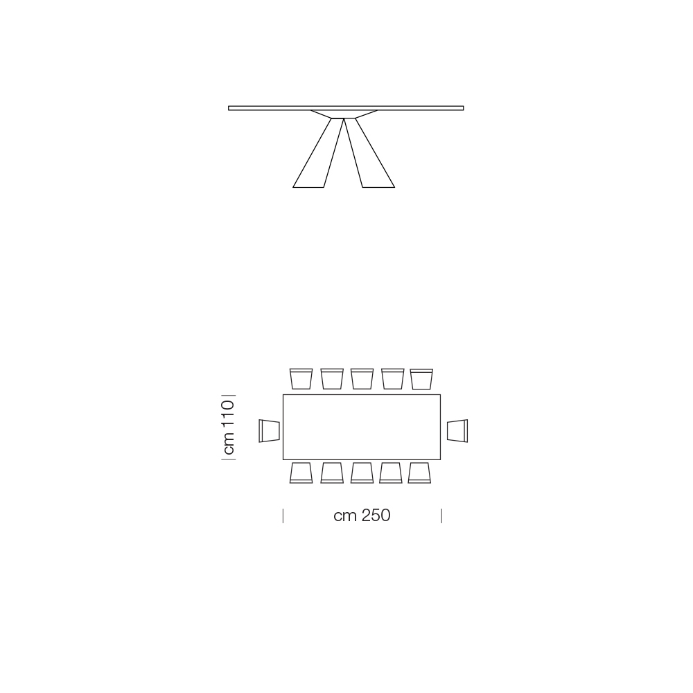 - L 250 x D 110 x H 75.5 cm (12 seats).
