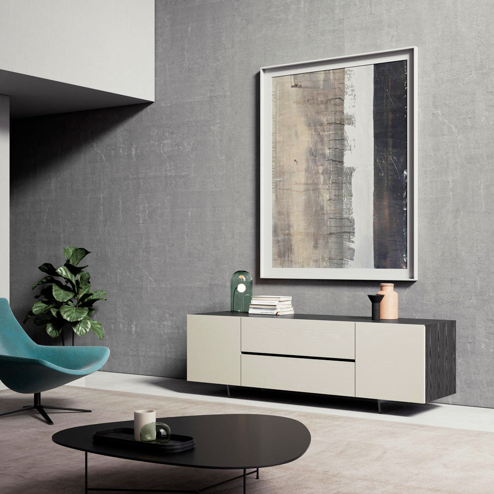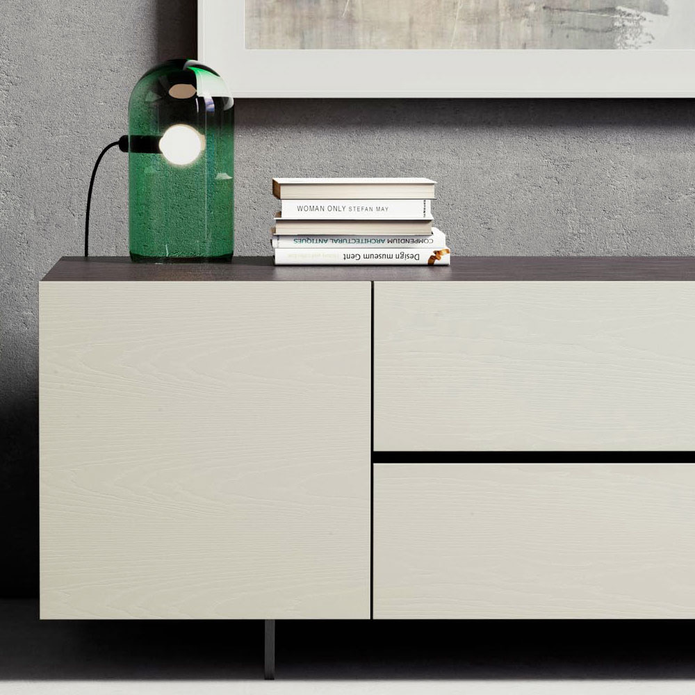 Sideboard veneered on solid faux poplar chipboard with clay lacquered doors and smoked ash shell . Legs in methacrylate H 15cm (H total 83cm).