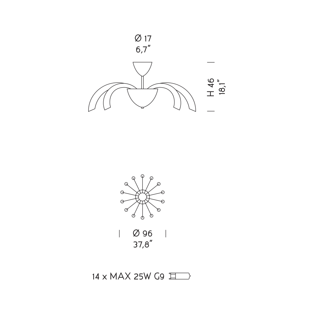 Ceiling lamp with 14 lights made of Venice glass with amber finish handcrafted by skilled Italian glass masters and enriched with chromed metal details. An engaging aesthetic that adapts to any type of environment in which it fits with exuberance thanks to its shapes and the functionality of its design. The wonderful and elegant curved arms expand outwards to bring light in various directions and illuminate the room through an original scenographic effect that recalls the explosion of fireworks for a creative , refined and strong visual impact result.
