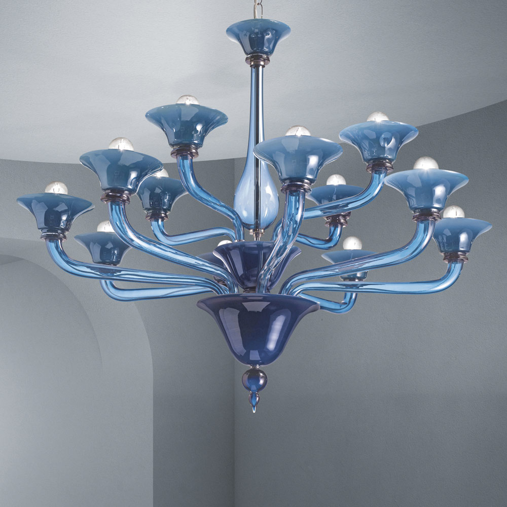 Handcrafted 12 lights chandelier in blue Venice glass Made in Italy.