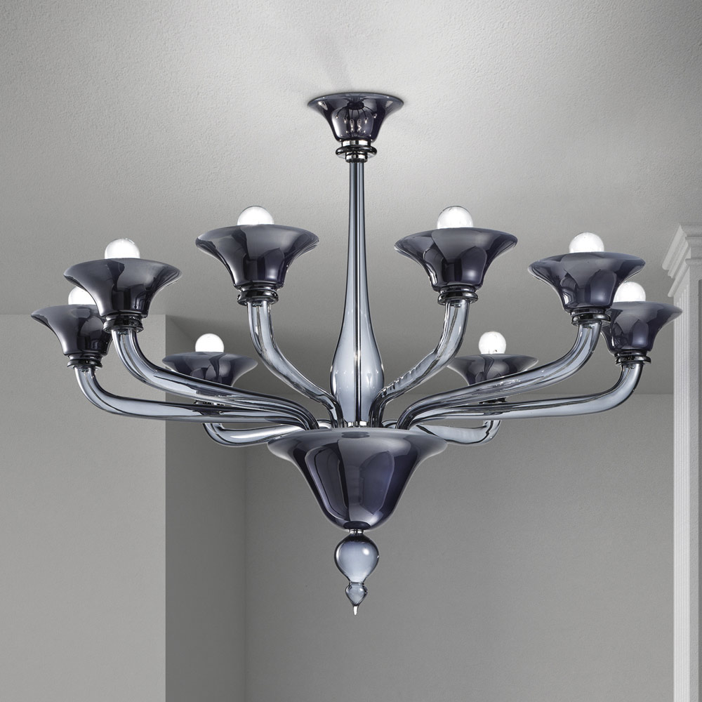 Chandelier handcrafted in Italy in Venice glass with milk white-gray finish with metal details in polished chrome finish . An unprecedented encounter between historical lines and contemporary design to give life to a piece of furniture with timeless charm and elegance. Its aesthetic is characterized by an articulated volume that becomes dynamic and light through the luminous vibration of the marvelous blown glass surfaces that alternate the elegant transparent arms with the cups made through the use of the casing technique . To underline its value is the attention to detail that transpires from the chromed metal components which allow the product to adapt to different tastes and situations of use.