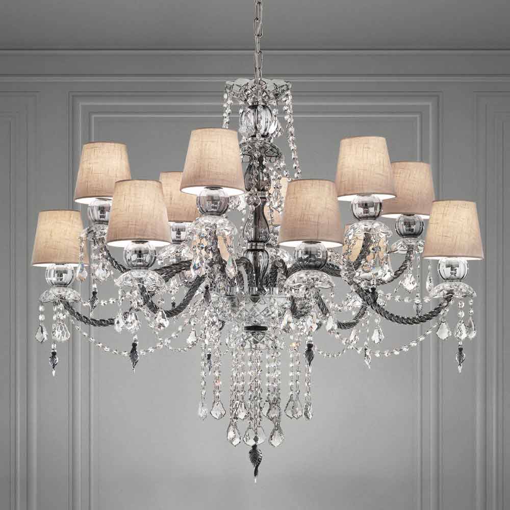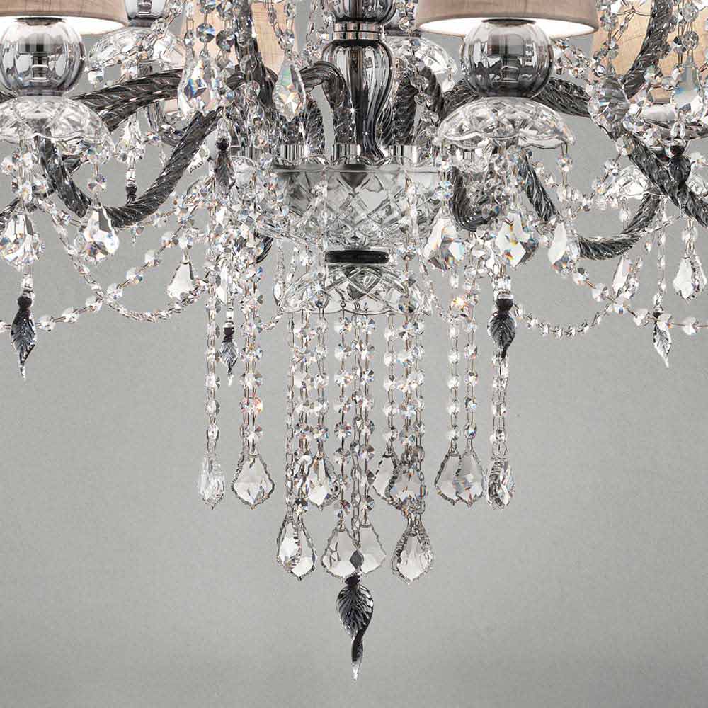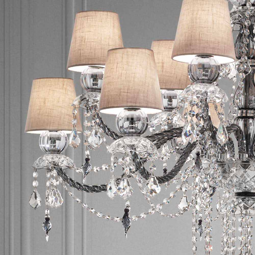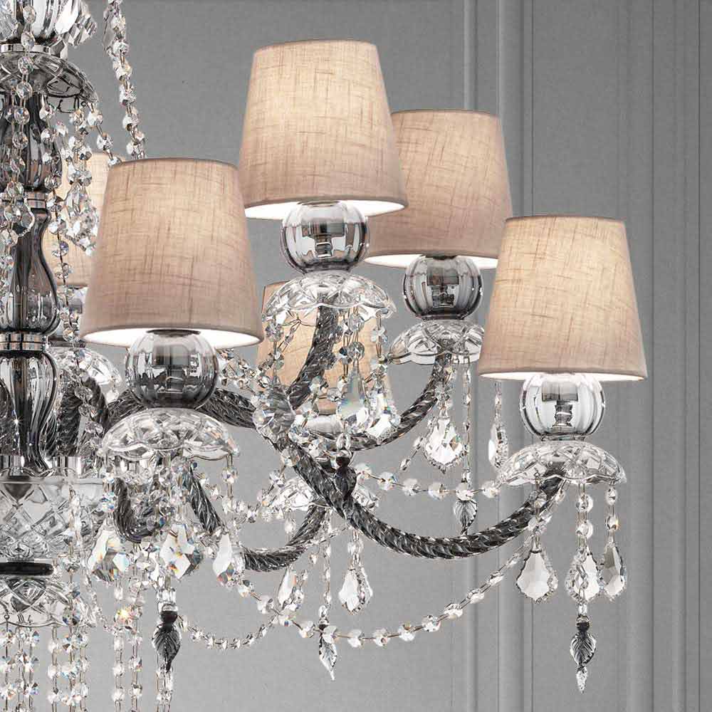 Elegant and imposing chandelier with 12 linen lampshades , structure in Venetian glass gray finish enriched by pendants in crystal finish and details in polished chrome metal , handcrafted in Italy . Characterized by a romantic character able to fill large rooms in an exclusive way, this chandelier stands out thanks to luminous pendants and refined lampshades that give life to a dynamic furnishing solution with a strong scenographic impact . To increase its value and to underline its aesthetic side is the presence of sequins which, through the refraction of light, give life to wonderful plays of light and shadow thanks to unprecedented colored flashes .