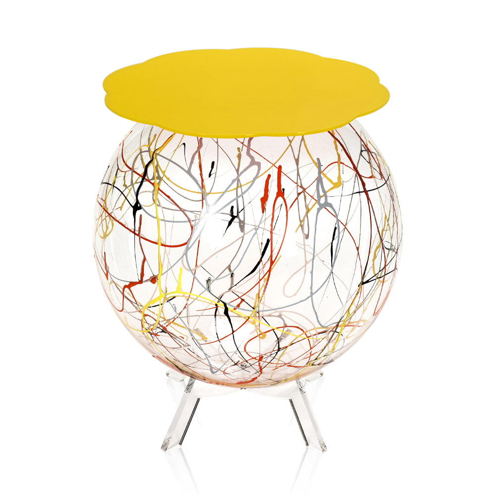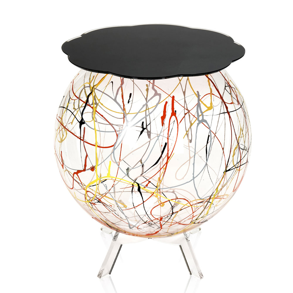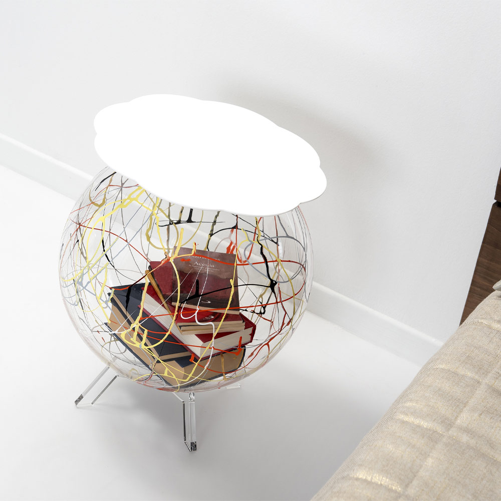 The spherical and wide structure is made entirely of transparent plexiglass from 100% virgin polymer with a spray paint finish in homage to Jackson Pollock and the shelf available in various colors. The final design is thus original and easy to place in the home.