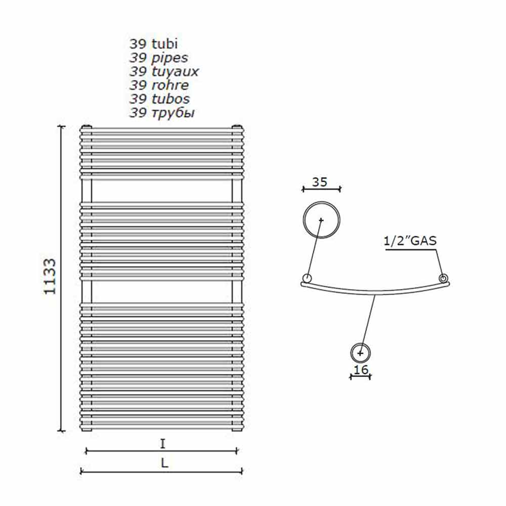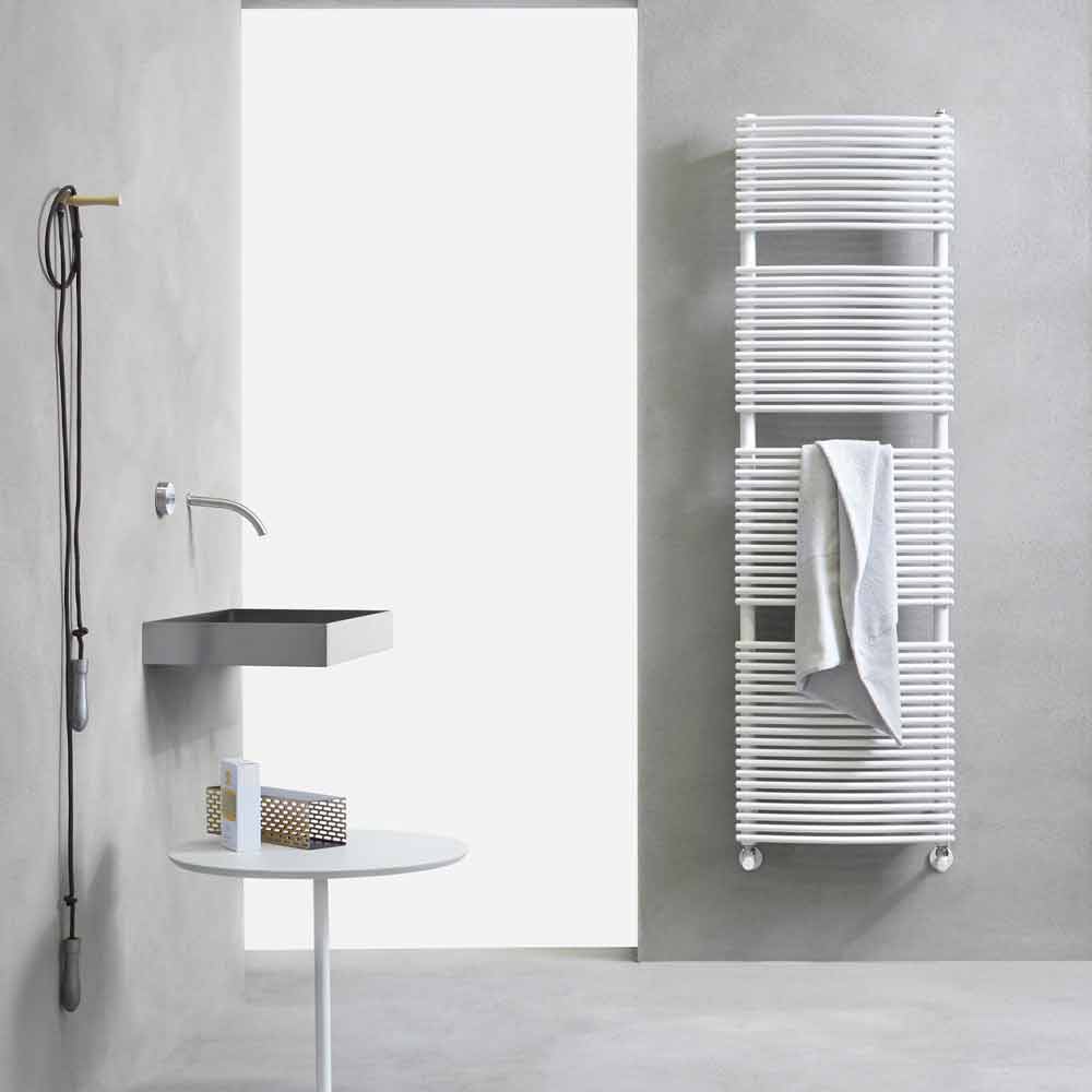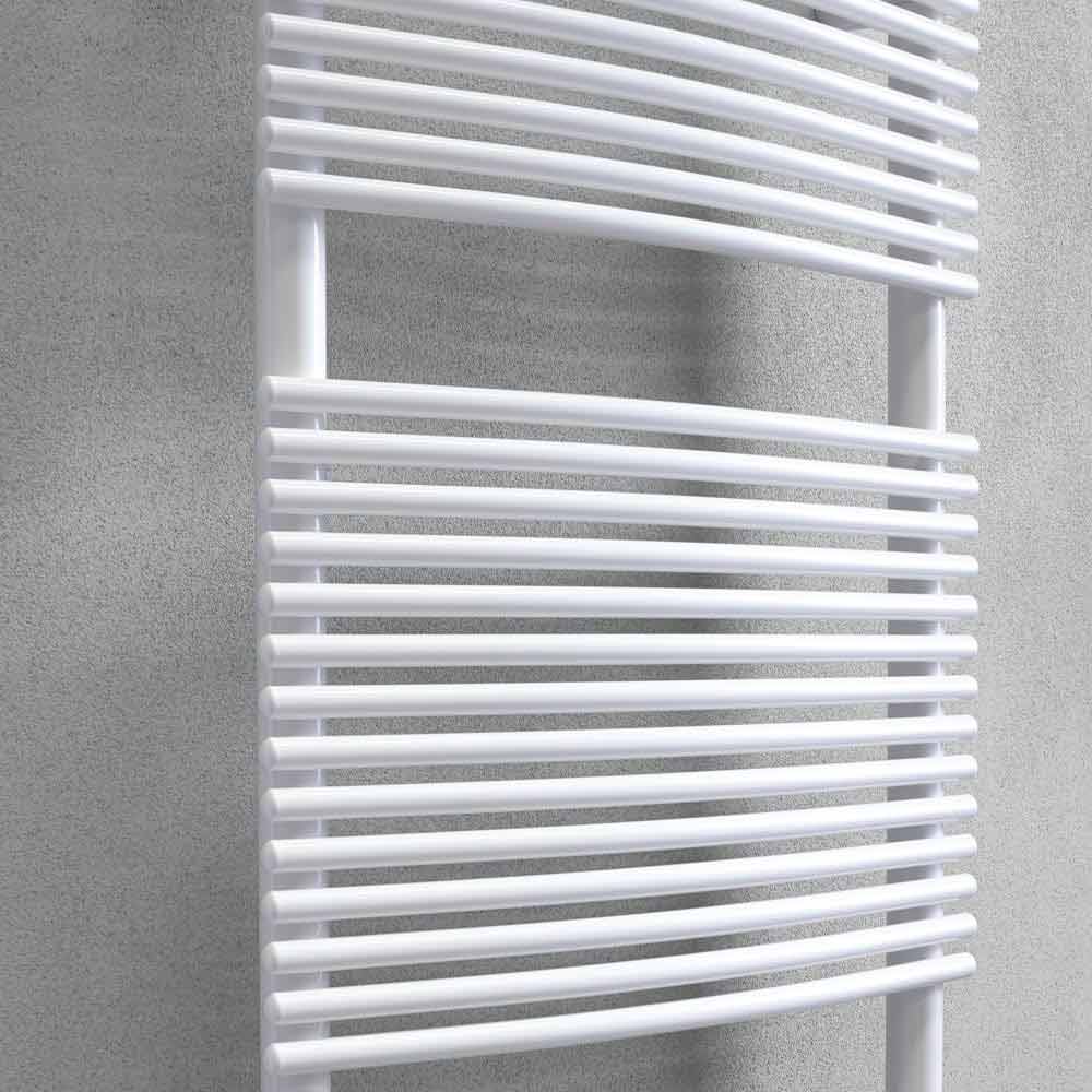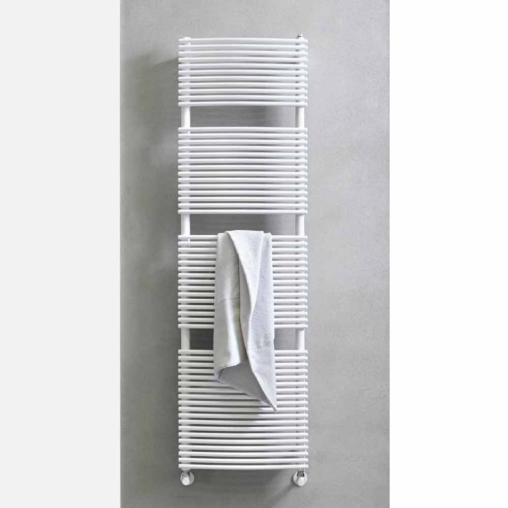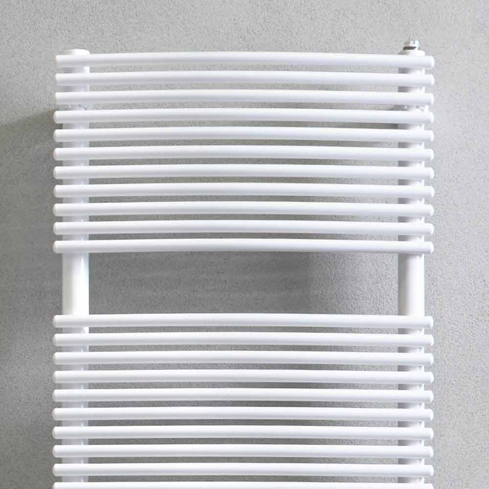 This towel warmer is made up of vertical round tubes with a diameter of 35 mm and horizontal round tubes with a diameter of 16 mm curved. The final design is elegant and unusual, easily adaptable to any style.