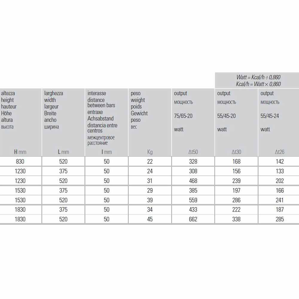 - H 1230 x L 375 x Inter. 50 x P 48 mm x Output w (Īt50 °) 308; Yield w (Īt30 °) 156; Yield w (Īt26 °) 133