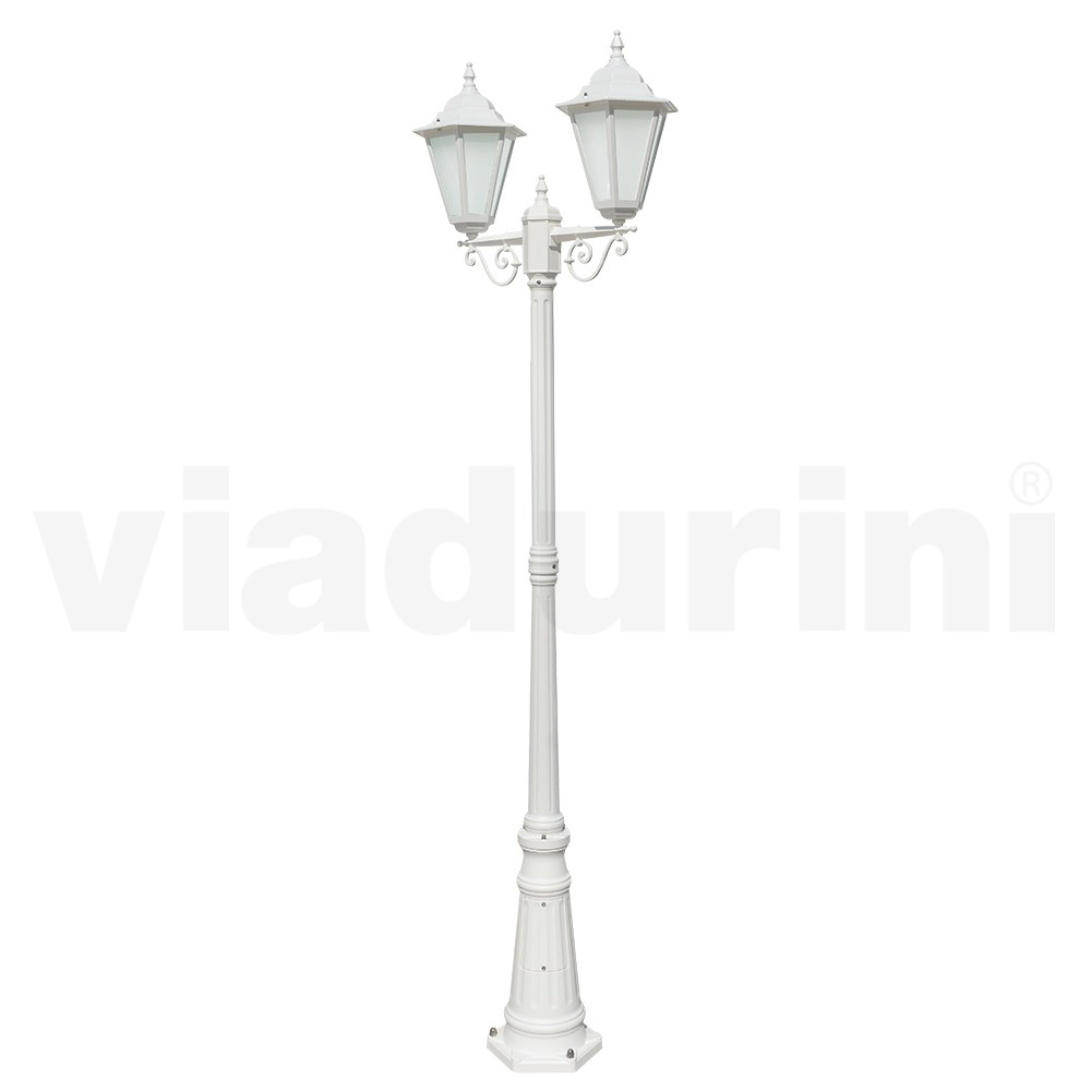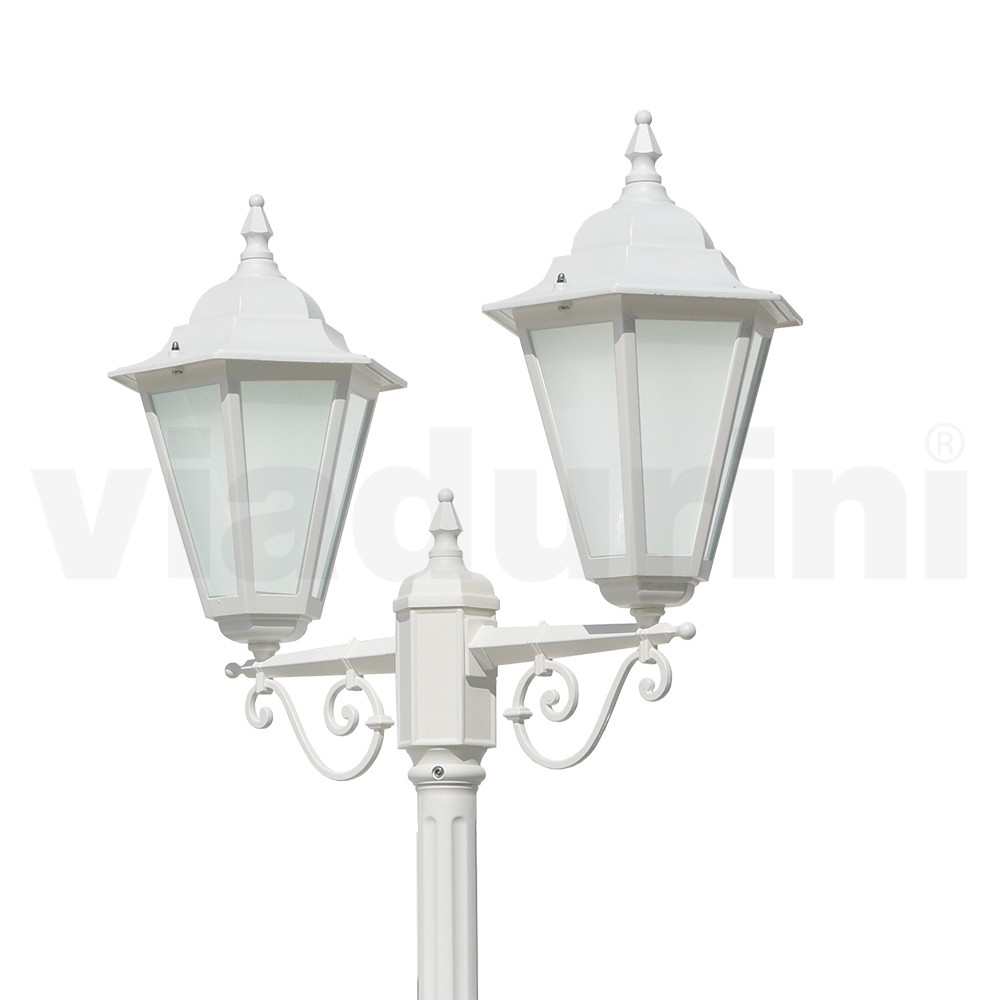 2-light street lamp with die-cast aluminum structure, embossed white finish and glass diffuser entirely made in Italy . Complete with stainless steel screws. A furnishing solution capable of combining functionality and style, offering quality lighting and at the same time completing the surrounding atmosphere thanks to a refined and fascinating touch . Ideal for spaces such as gardens, avenues and walkways but also contract environments such as bars and restaurants.