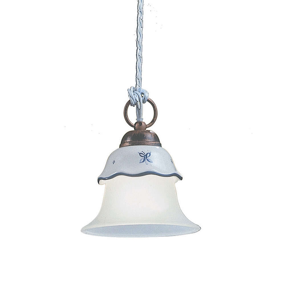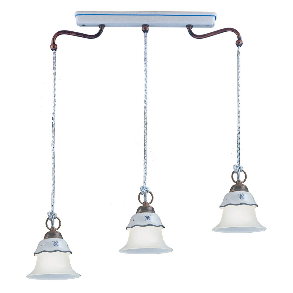 Suspended lamp 3 lights in iron, hand-decorated ceramic and acid-etched glass made in Italy by Ferroluce.