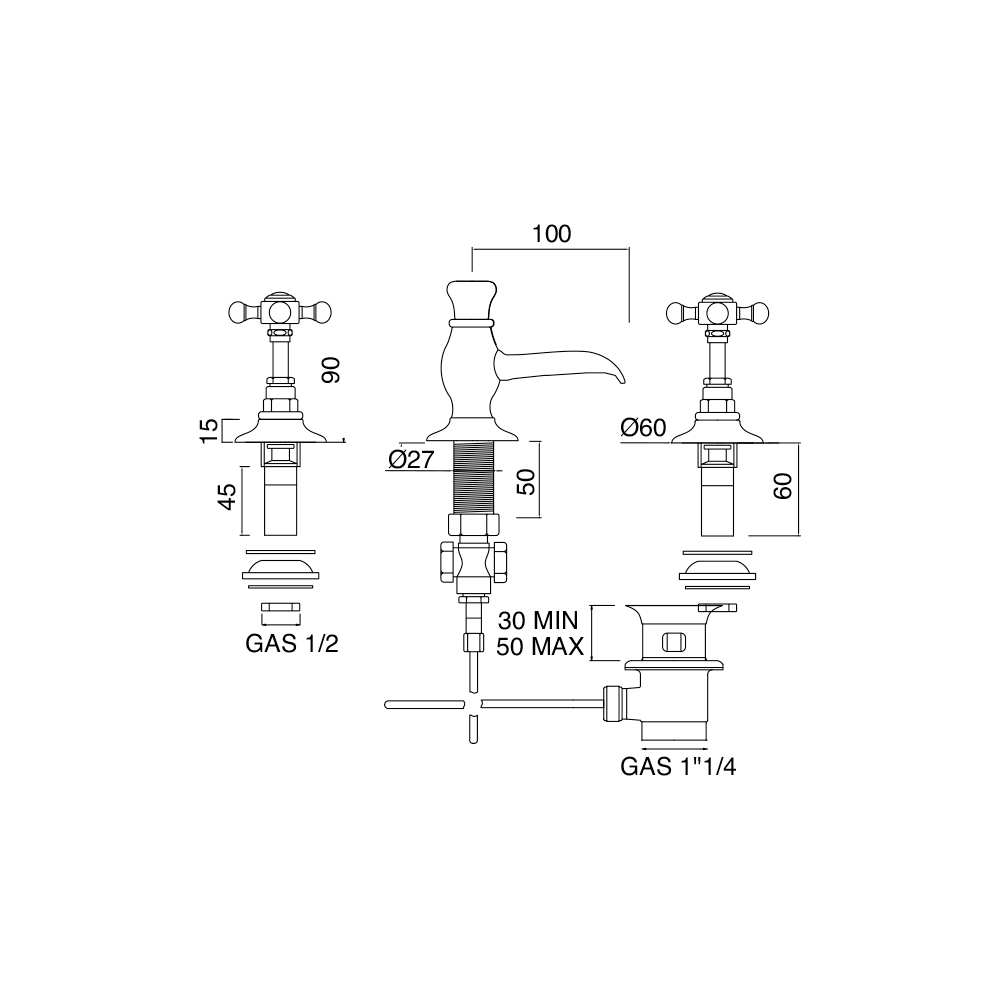 Brass 3-hole bidet faucet ofĀ vintage design Elisea, made in Italy.