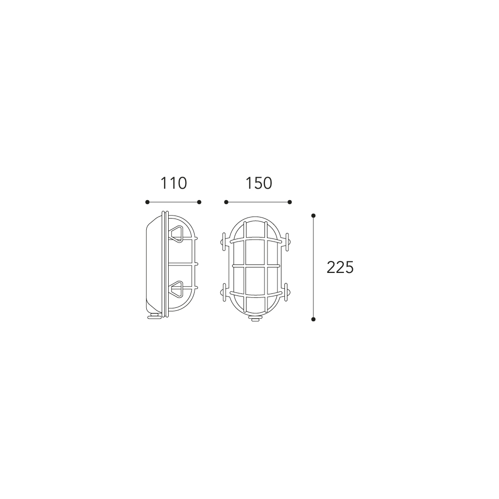 The oval diffuser , available in clear glass or opal glass , is protected by a solid metal grille that recalls the nautical and industrial world, while ensuring safety and durability . The light is functional and enveloping , perfect for illuminating facades , entrances , external staircases and outdoor spaces .